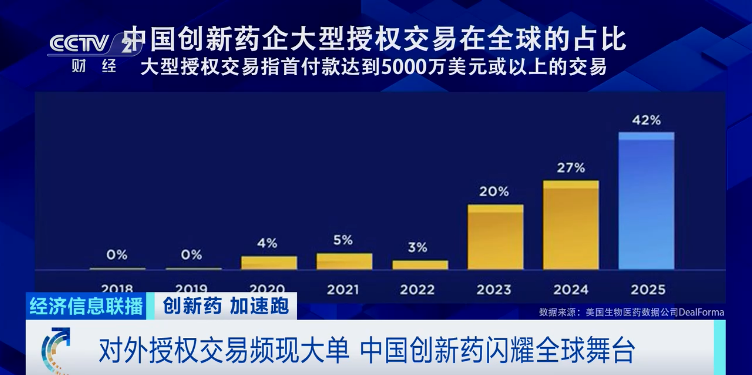 宏观上来看,美国生物医药数据公司DealForma在今年5月份发布的报告显示:中国生物医药企业在全球大型授权交易,也就是首付款达到5000万美元或以上的交易中,按数量看占比已达42%,这一比例与去年的27%和前年的20%相比显著增加。