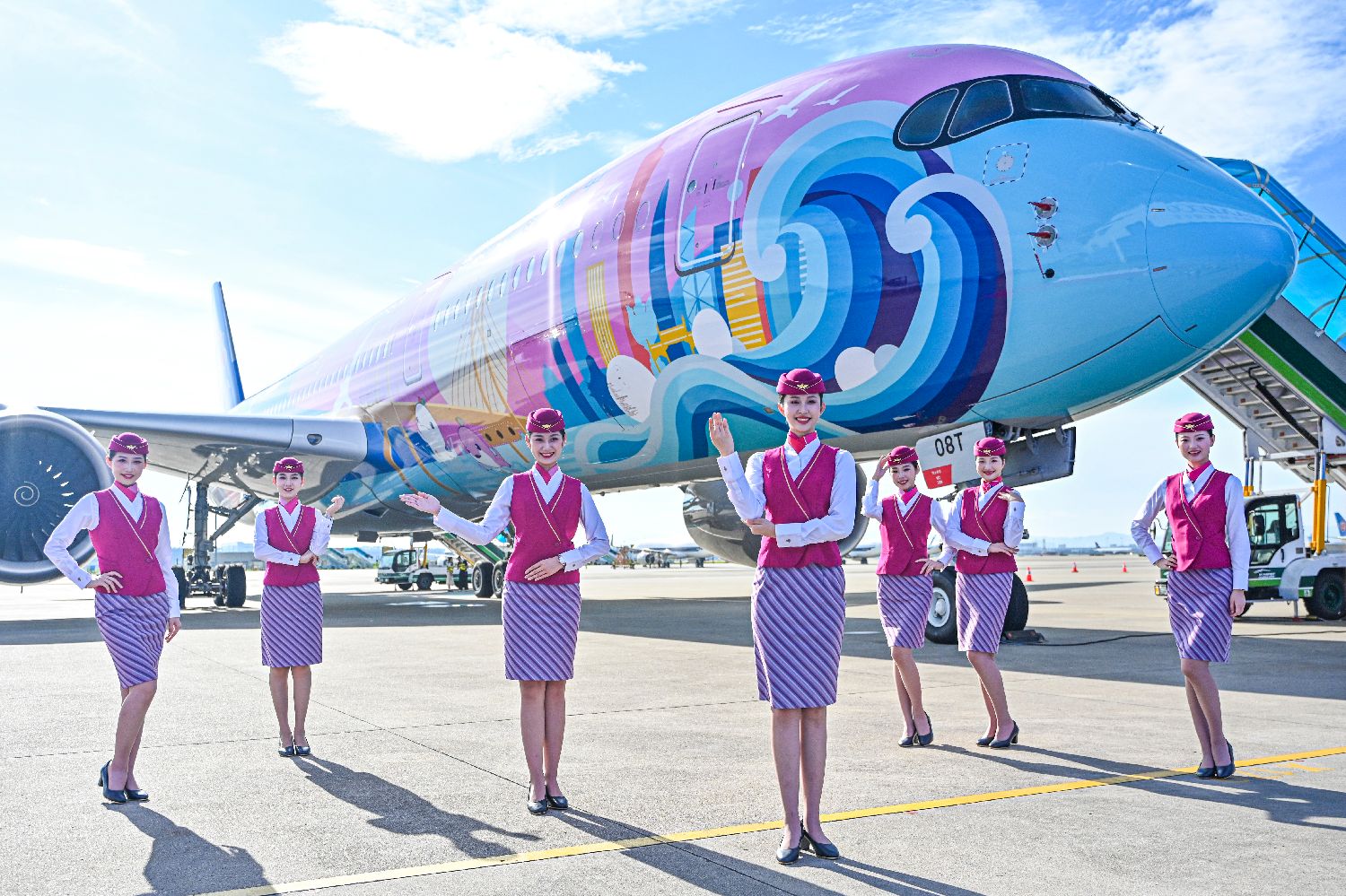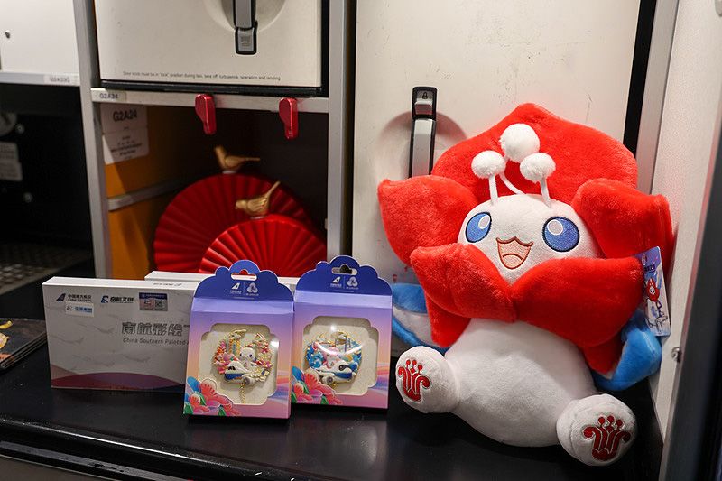 9月19日,中国南方航空首架十五运会主题彩绘飞机“活力湾区号”在广州白云国际机场正式亮相并投入运营。该飞机以“活力湾区 跃动世界”为主题,机身外部彩绘融合港珠澳大桥、十五运吉祥物“喜洋洋”和“乐融融”、海鸥及木棉花等元素,客舱内饰以锦鲤、木棉花、十五运会标识点缀,为乘机旅客营造浓厚赛事氛围。图为“活力湾区号”外部彩绘。(中新社)