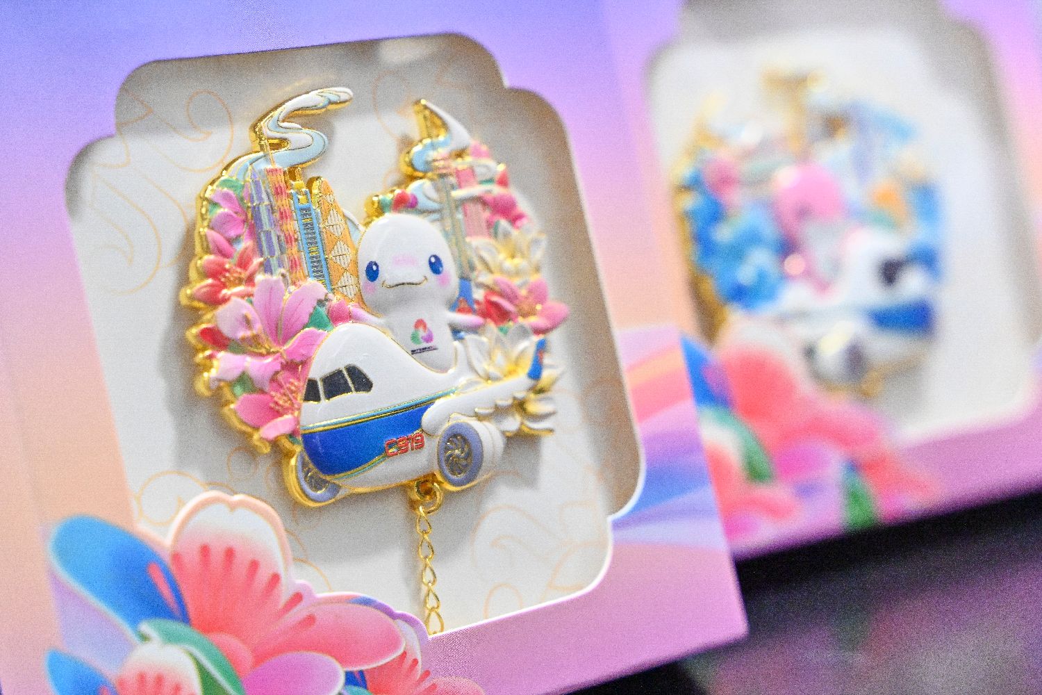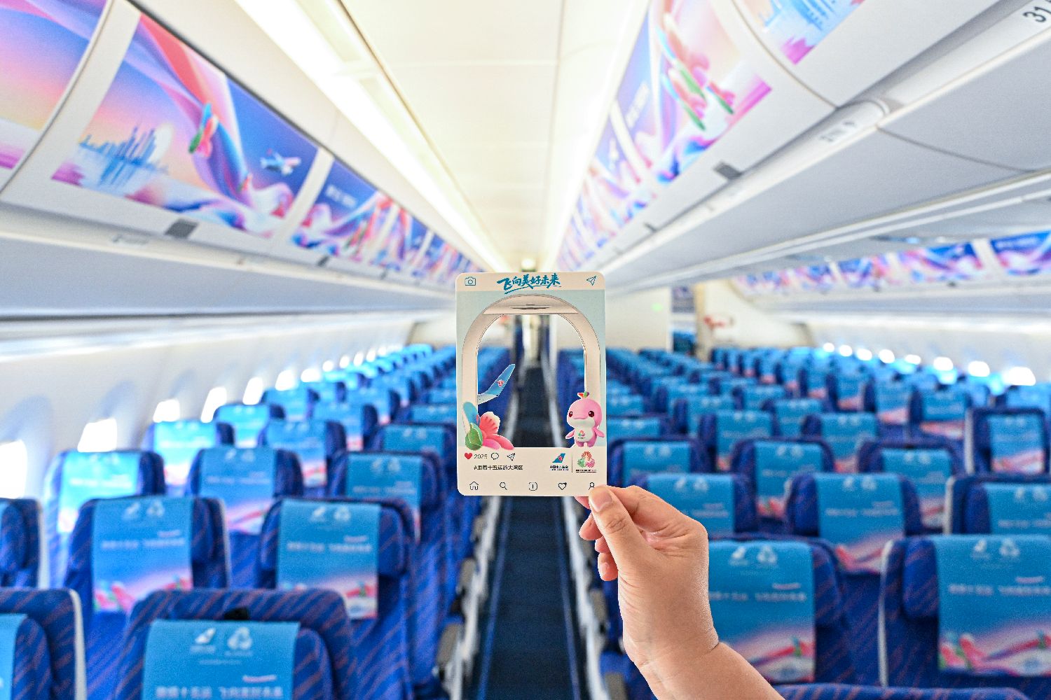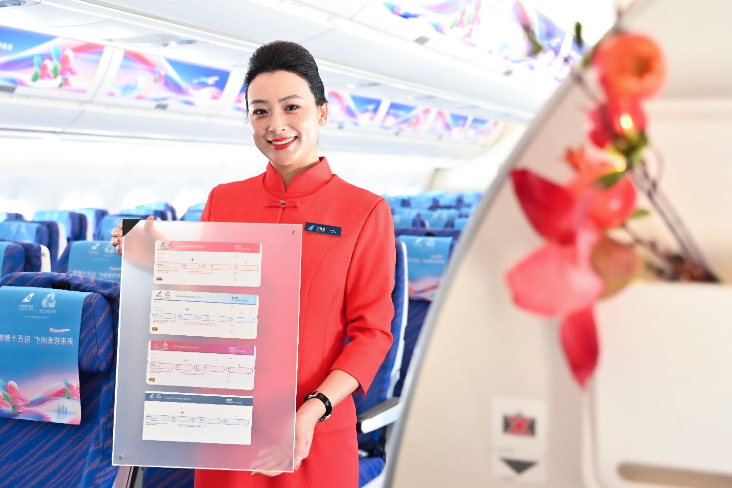 图为机组人员展示十五运会和残特奥会主题登机牌。(中新网)