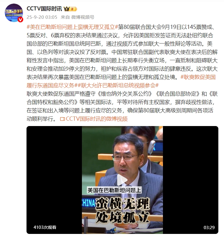 第80届联合国大会9月19日以145票赞成、5票反对、6票弃权的表决结果通过决议,允许因美国拒发签证而无法赴纽约联合国总部的巴勒斯坦国总统阿巴斯,通过视频方式参加联大一般性辩论等活动。美国、以色列等对该决议投了反对票。中国常驻联合国副代表耿爽大使在表决后的解释性发言中指出,美国在巴勒斯坦问题上长期奉行失衡立场,一直抵制和阻碍联大和安理会推动加沙停火的努力,袒护和纵容占领方对国际法的肆意违反。这次联大表决结果再次暴露美国在巴勒斯坦问题上的蛮横无理和孤立处境。