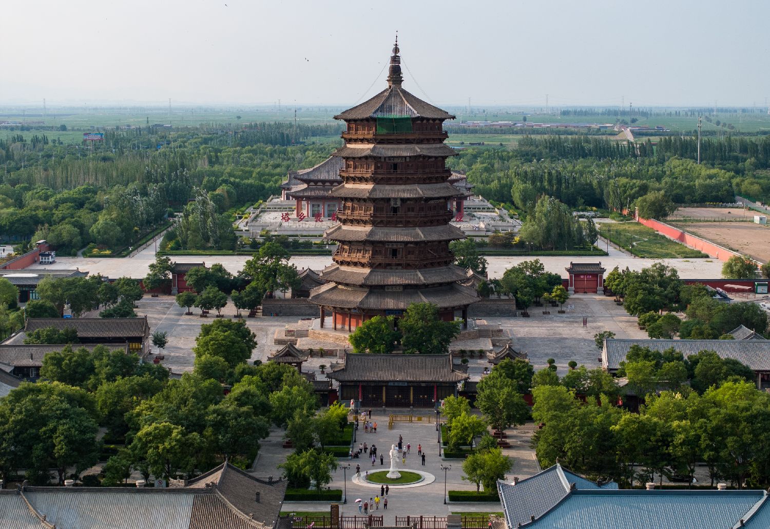 7月1日,航拍应县木塔。山西应县木塔建于公元1056年,塔高67.31米,底层直径30.27米,是世界上现存最高大、最古老纯木结构楼阁式建筑。(图/中新社)