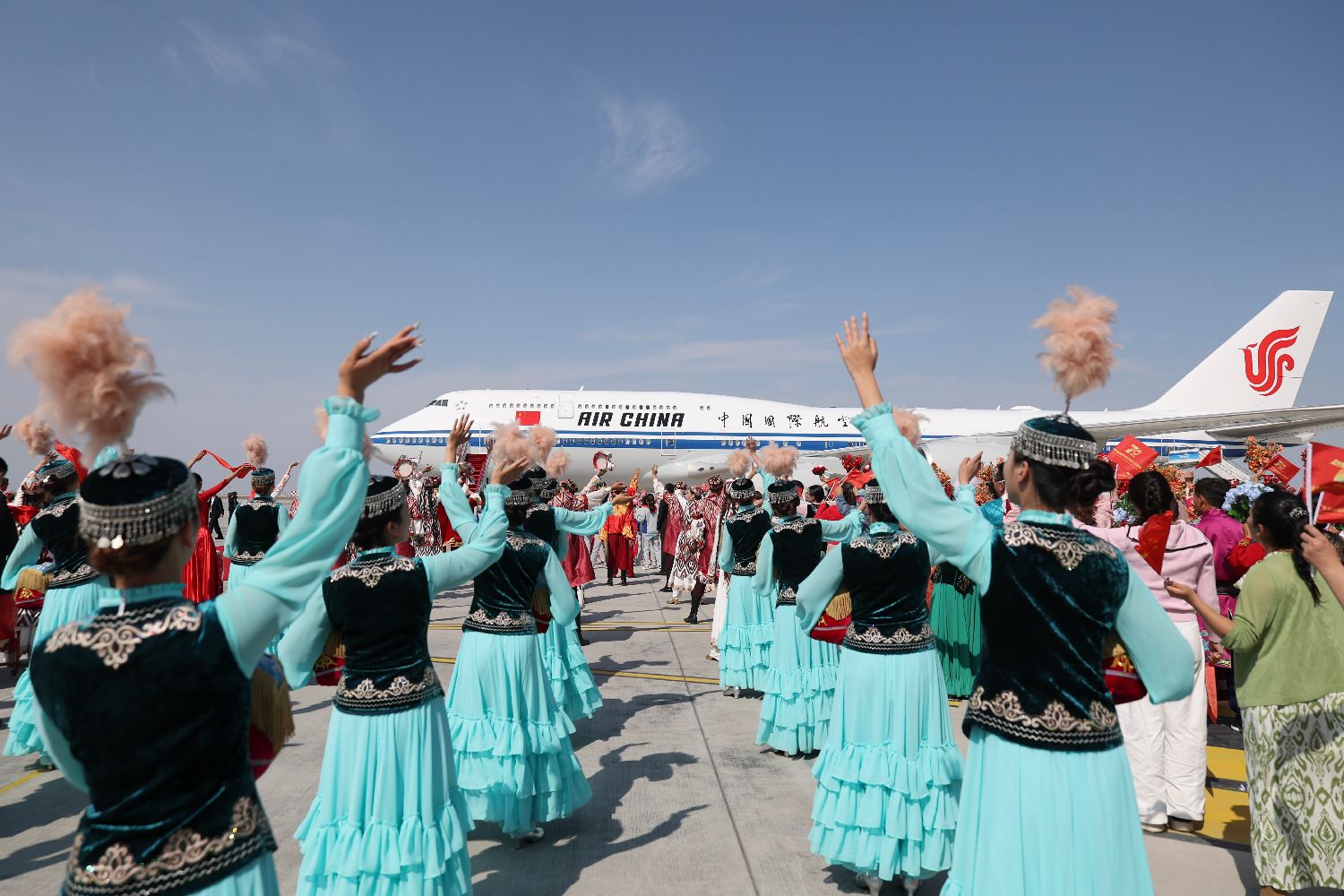当地时间9月23日下午,中共中央总书记、国家主席、中央军委主席习近平率中央代表团乘专机抵达乌鲁木齐,出席新疆维吾尔自治区成立70周年庆祝活动。习近平等在机场和乌鲁木齐市区受到新疆各族群众的热烈欢迎。(图/中新社)