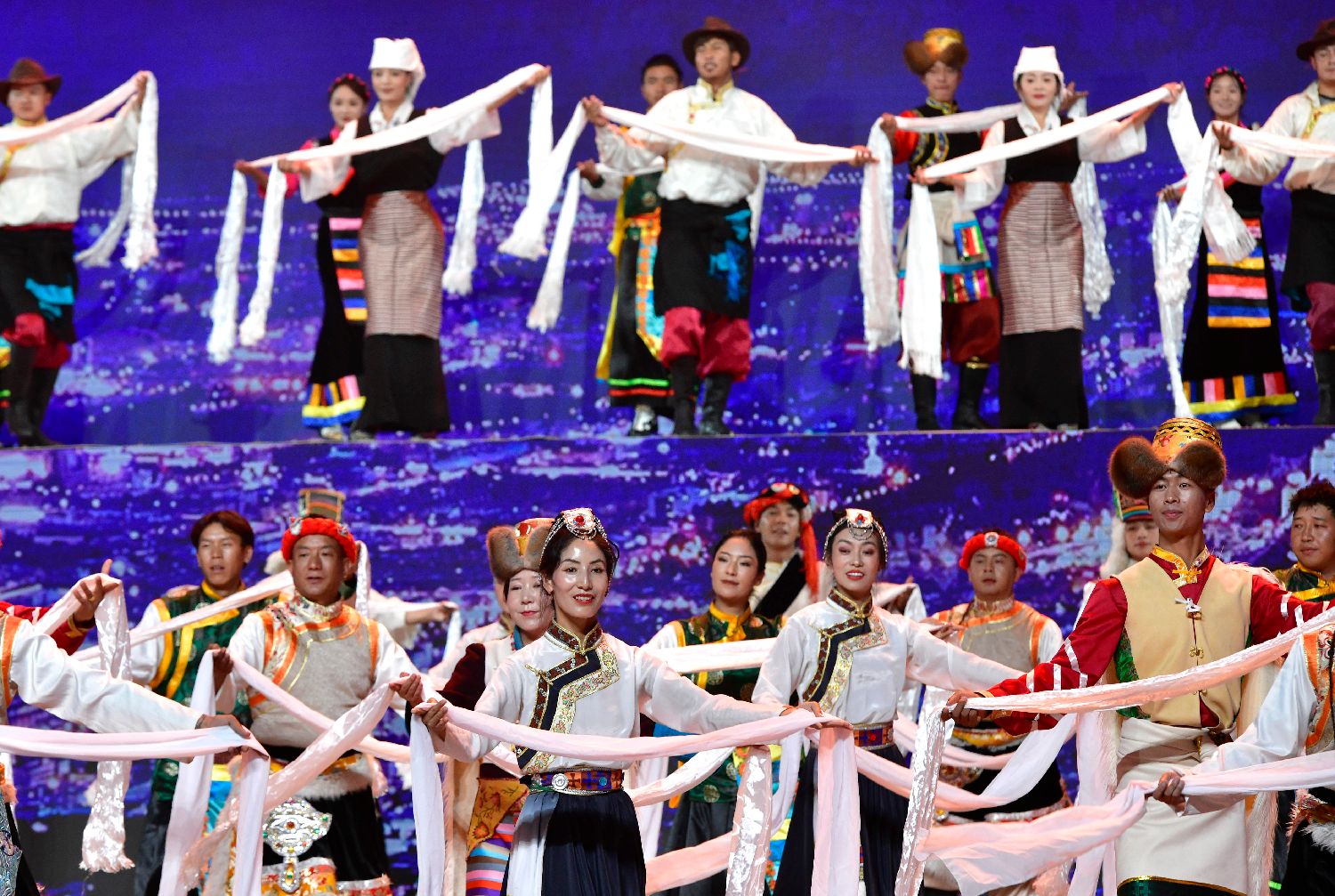 当地时间9月11日晚,拉萨市庆祝西藏自治区成立60周年专场慰问演出在金城公主剧场举行。演出通过歌声、舞蹈、杂技等方式为西藏自治区成立60年以来取得的辉煌成就喝彩。(图/中新社)