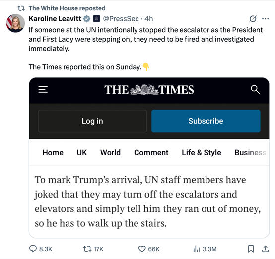 她还附上了一张英国《泰晤士报》的报道截图,该报上周日(21日)称,联合国工作人员曾开玩笑说,他们可能会关掉自动扶梯和电梯,这样可以告诉特朗普:联合国“没钱了”。