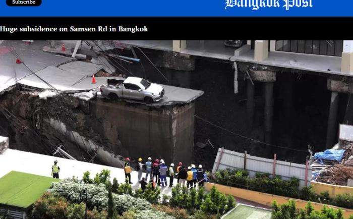 中新网9月24日电据泰国《曼谷邮报》报道,9月24日上午,泰国曼谷一道路发生大面积塌陷,形成一个深约50米的巨坑。