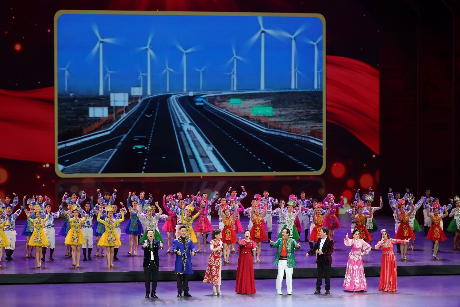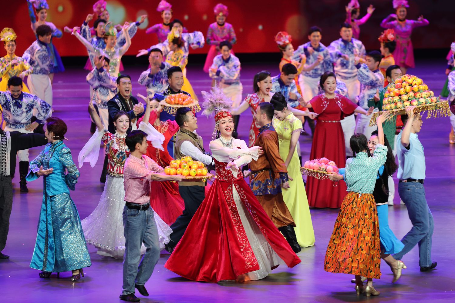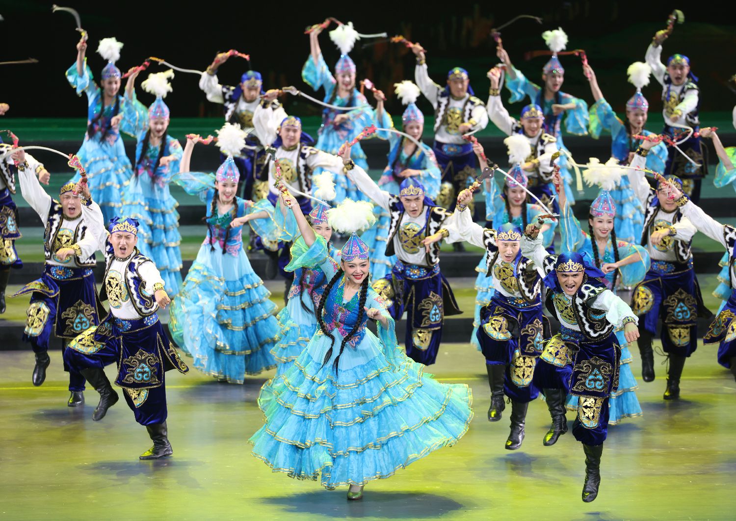 9月24日晚,庆祝新疆维吾尔自治区成立70周年文艺晚会《美丽新疆》在乌鲁木齐文化中心大剧院举行。(中新社)
