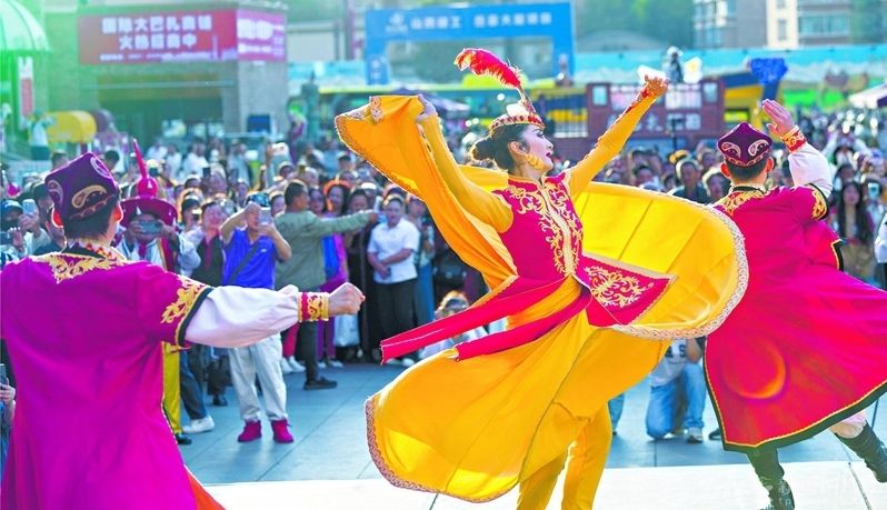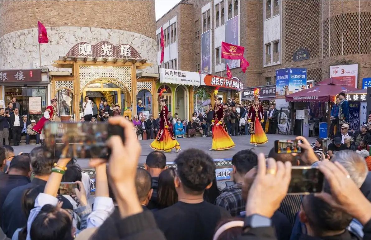 9月22日,游客在新疆乌鲁木齐市大巴扎步行街欣赏民族舞蹈表演。(北京《中国日报》)
