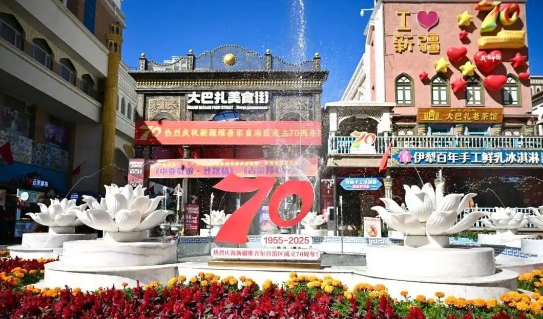 “我们新疆好地方”,天山南北物华新。春华秋实,岁物丰成。2600多万天山儿女,迎来了新疆维吾尔自治区成立70周年。乌鲁木齐处处花团锦簇、彩旗飘扬。一组组精心设计的园林景观点缀街头,将整座城市装点得绚丽多姿。大街小巷洋溢着喜庆祥和的节日气氛,这些动人的景致不仅扮靓了城市容颜,也展现出新疆各族民众的喜悦之情。