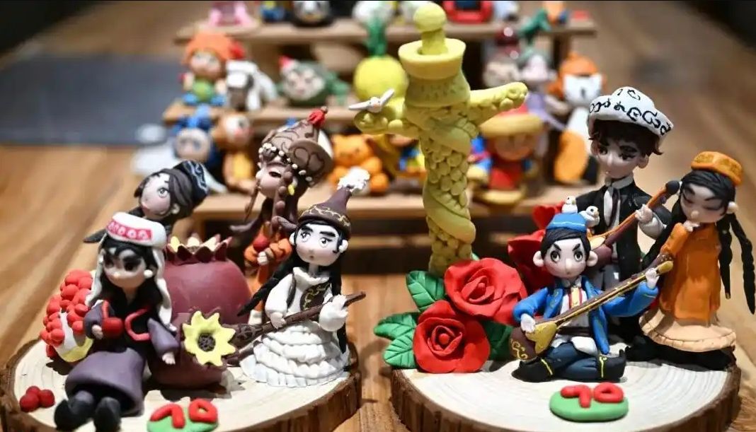 在大巴扎二期疆来城,非遗传承人手工制作的庆祝新疆维吾尔自治区成立70周年的主题面塑。(《乌鲁木齐晚报》)