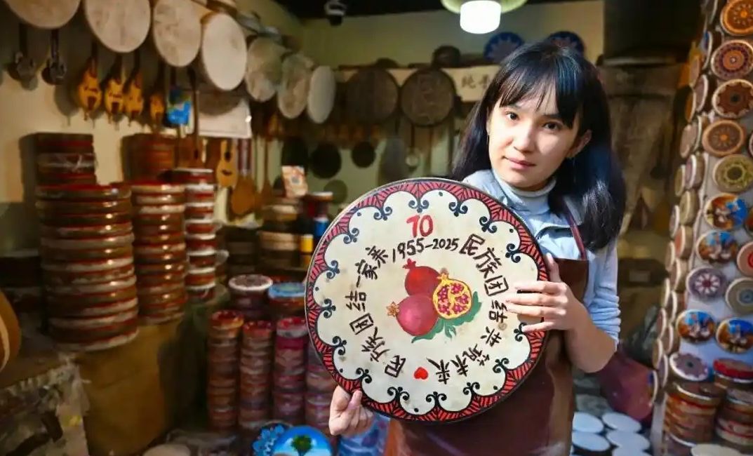 在大巴扎二期疆来城,非遗传承人手工制作的庆祝新疆维吾尔自治区成立70周年的主题手鼓。(《乌鲁木齐晚报》)