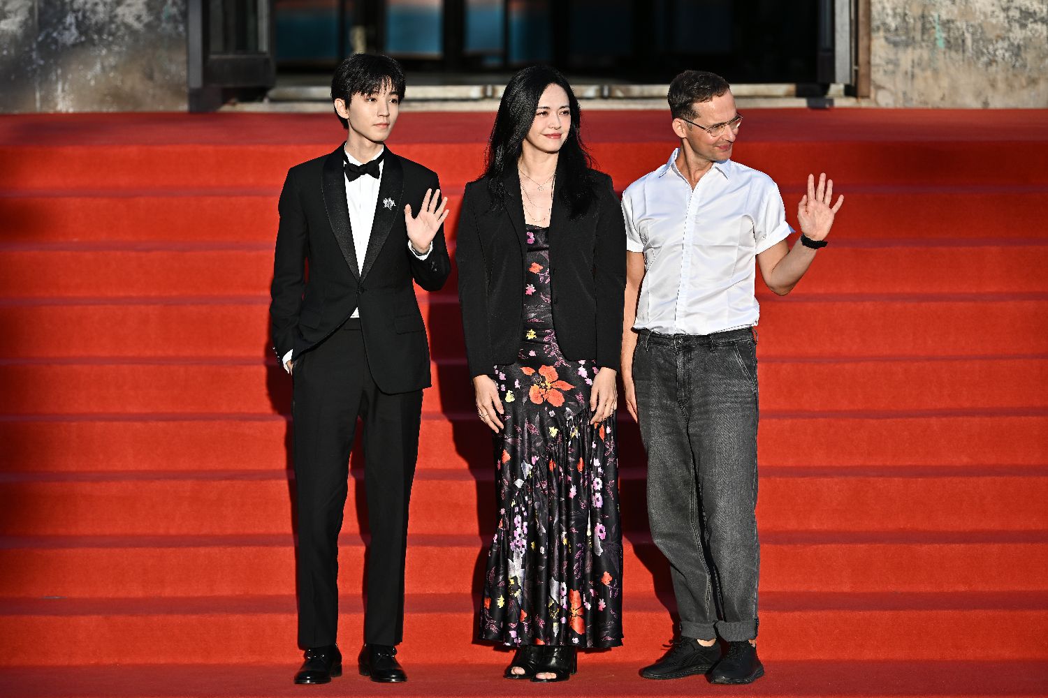 图为瑞士导演拉蒙·曲尔歇尔、演员王俊凯(左)、姚晨(中)亮相红毯。(中新社)