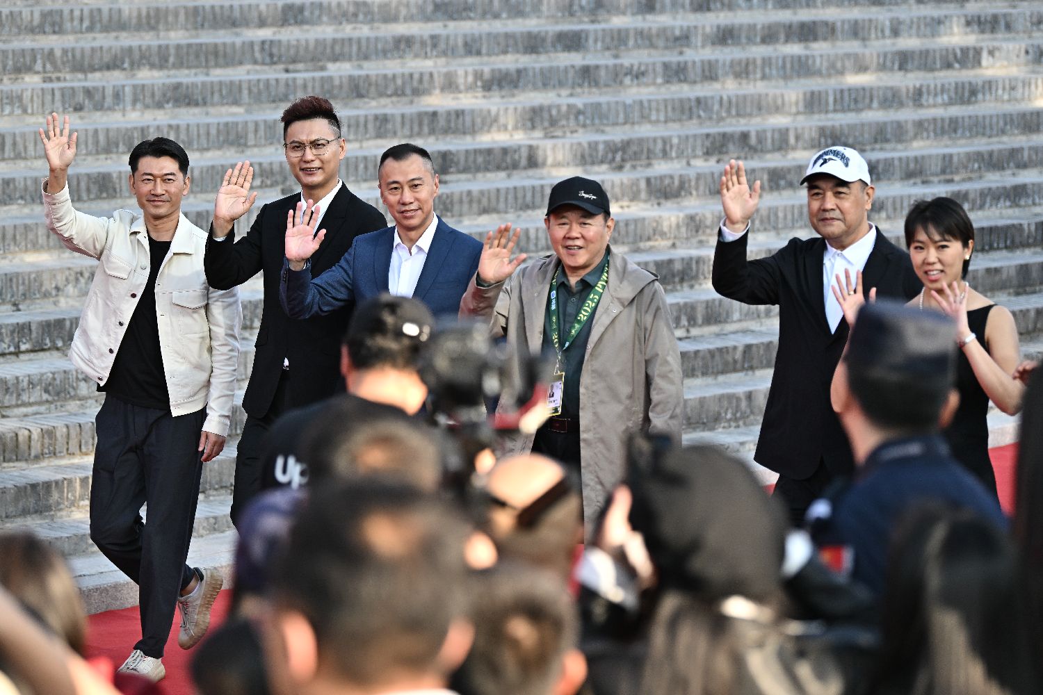 图为导演赵建平(右三)携电影《续范亭将军》主创人员亮相红毯。(中新社)