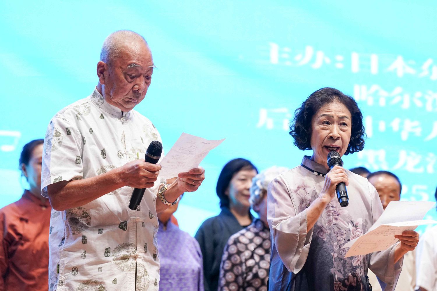 9月11日,日本遗孤及家属等来到黑龙江省哈尔滨进行日中友好之会·全日本遗孤代表感恩访问团文艺演出。图为日本遗孤、日本东京中国归国者·日中友好之会理事长池田澄江(右),日本遗孤桥本英树进行诗朗诵《我有两个家》。(图/中新社)