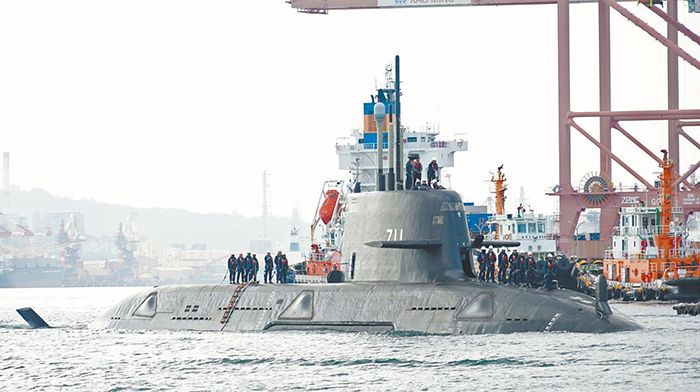 台自造潜艇“海鲲号”原定于9月完成海测,但至今仍未展开潜航测试。图为7月3日“海鲲号”自高雄港干坞出港,在外海进行浮航海测。(图/ 台北中时新闻网)