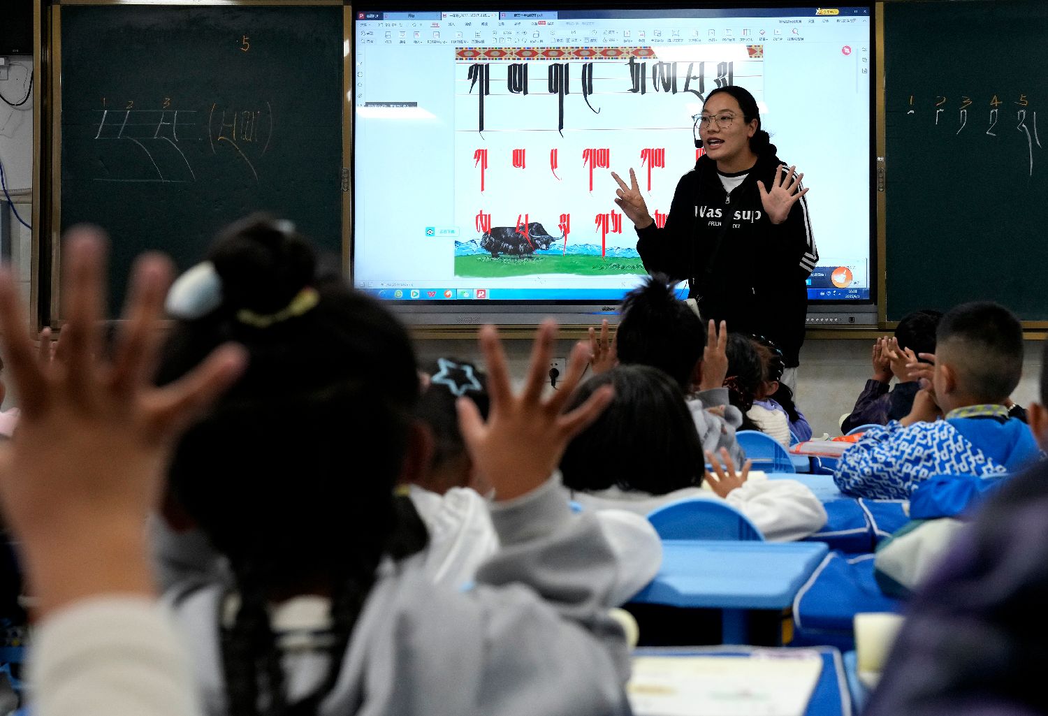 9月1日,拉萨市第一小学一年级二班,藏语文老师扎西央钦正在授课。近日,西藏拉萨市秋季学期开学,各项教学工作有序开展。(图/中新社)