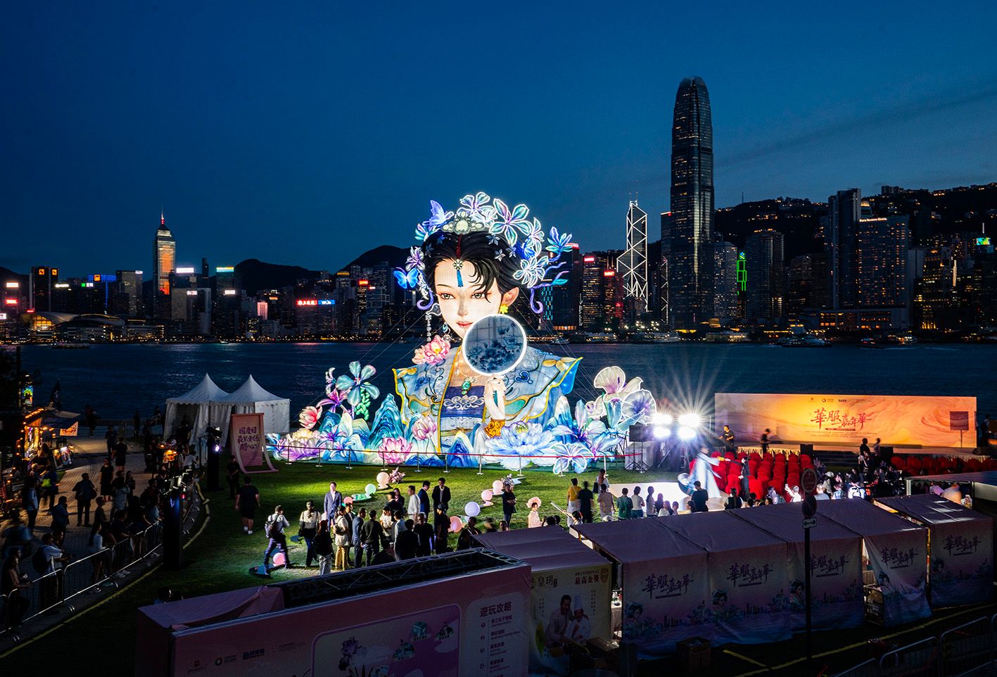 9月29日,“迎国庆·香港华服嘉年华”活动亮相香港西九文化区的海滨。图为巨型“香江仙子灯组”扮靓西九龙海滨。(中新社)