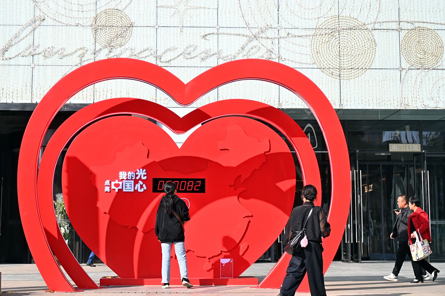 9月29日,临近国庆节,甘肃兰州街头新设的“国庆”主题展板吸引游客打卡。(中新社)