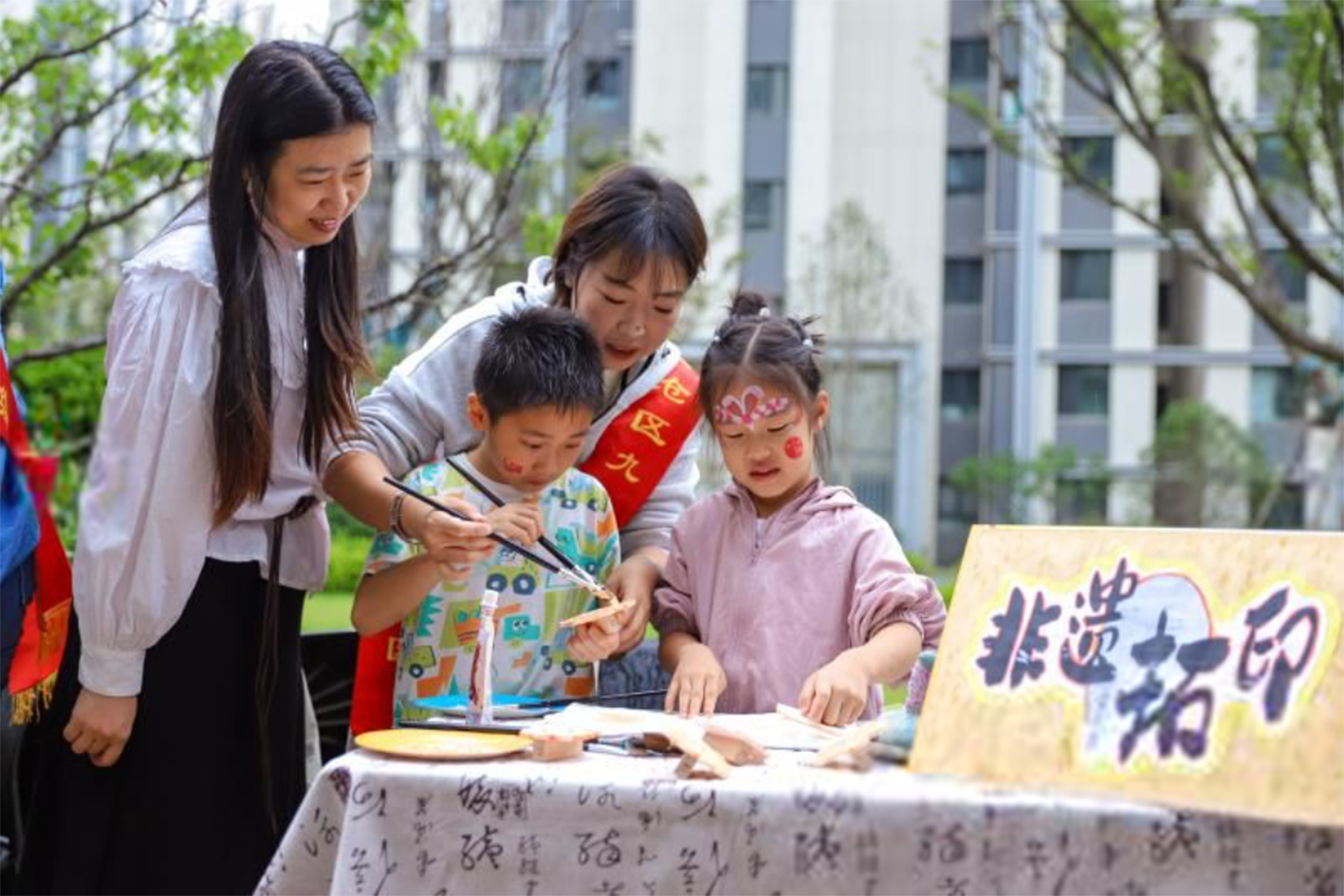 9月27日,小朋友在山东省青岛市李沧区浮山路街道金液泉路社区开展的“迎国庆 庆团圆”活动中体验拓印。(中新社)