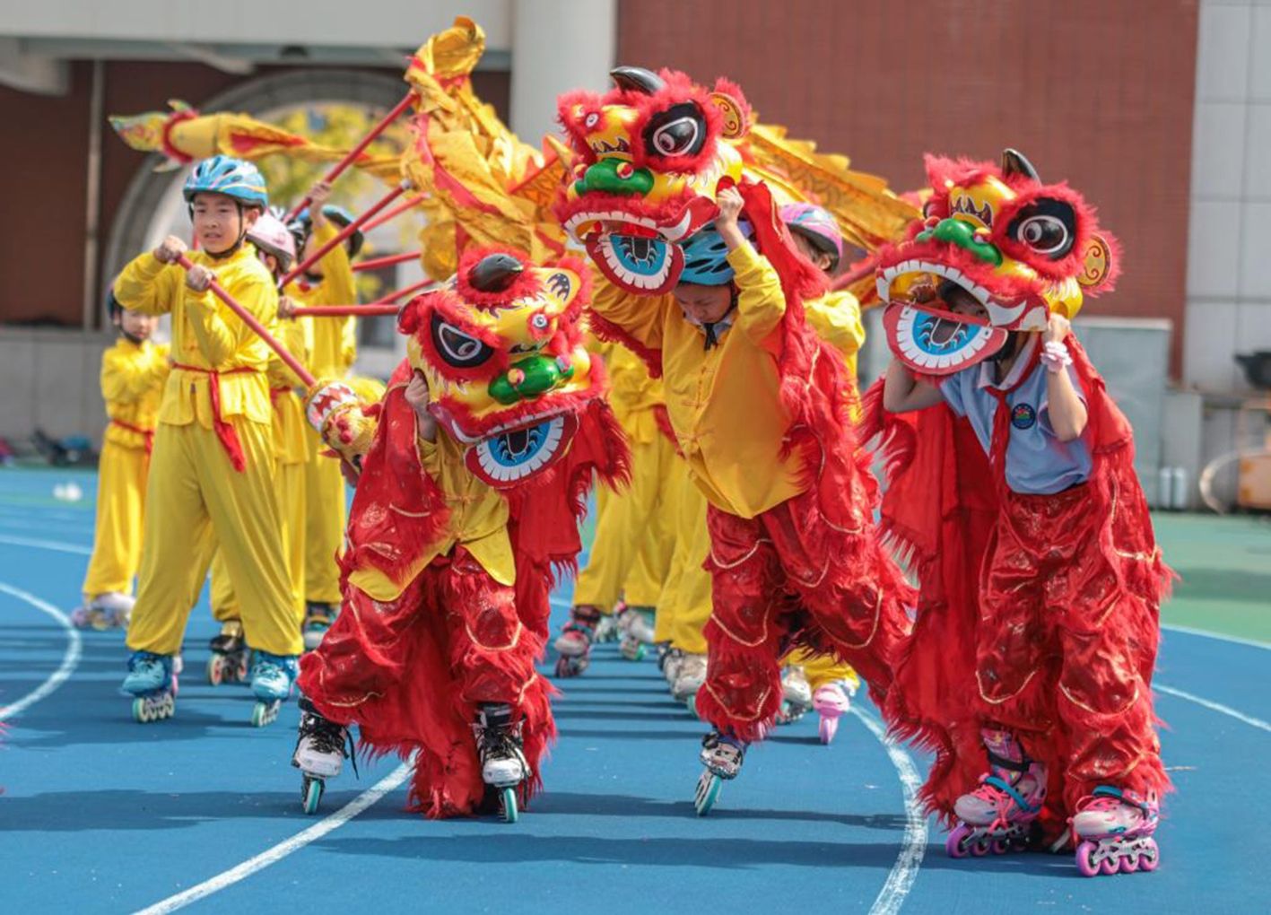 9月29日,在山东省荣成市实验小学,孩子们表演舞龙舞狮。(新华社)