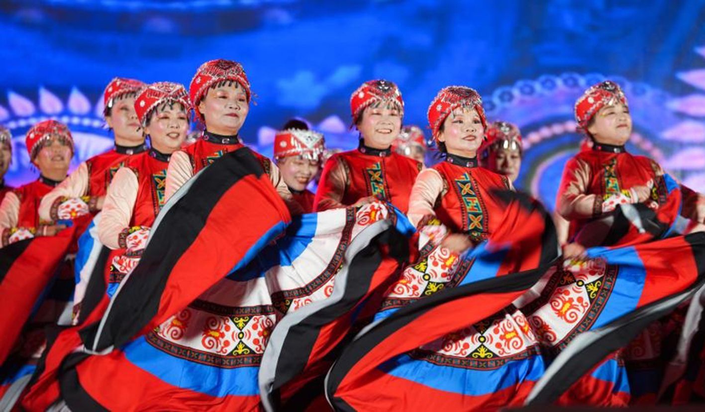 9月28日,农民广场舞表演队在山东省邹平市迎国庆群众广场舞大赛上表演。(新华社)