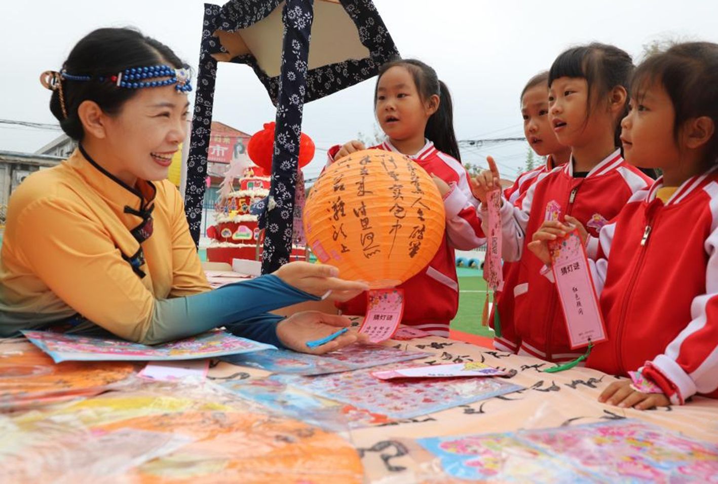 9月28日,在山东省滨州市沾化区冯家镇李家幼儿园,孩子们在“拾趣品中秋 童心迎国庆”活动上猜灯谜。(新华社)