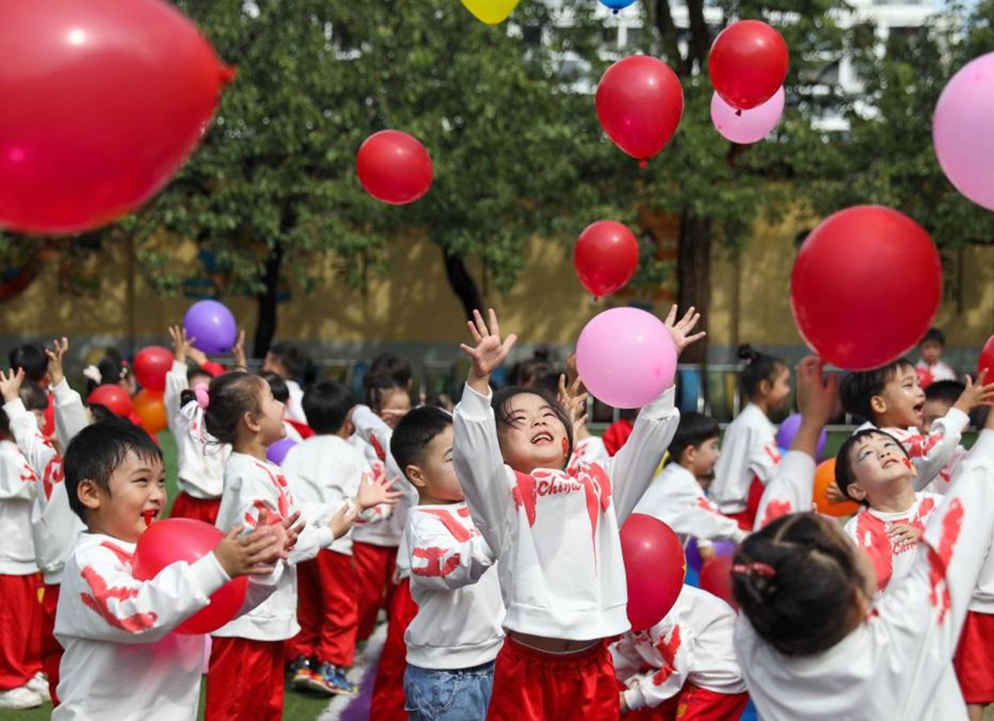 9月29日,河南省平顶山市宝丰县闹店镇中心幼儿园的孩子们在放飞气球。(新华社)