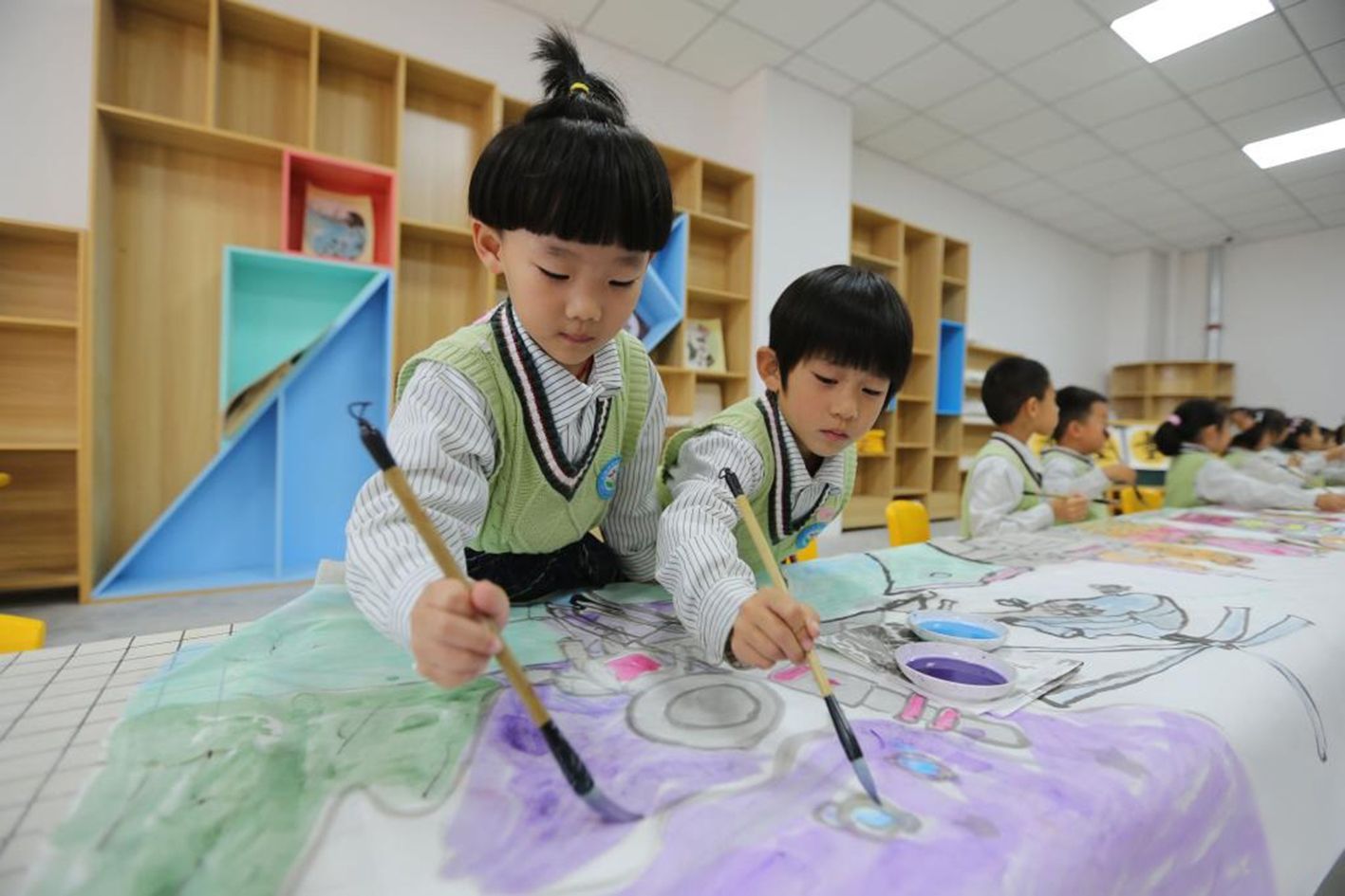 9月28日,甘肃省定西市安定区幼儿园的小朋友在绘制《我爱你中国》长卷。(新华社)