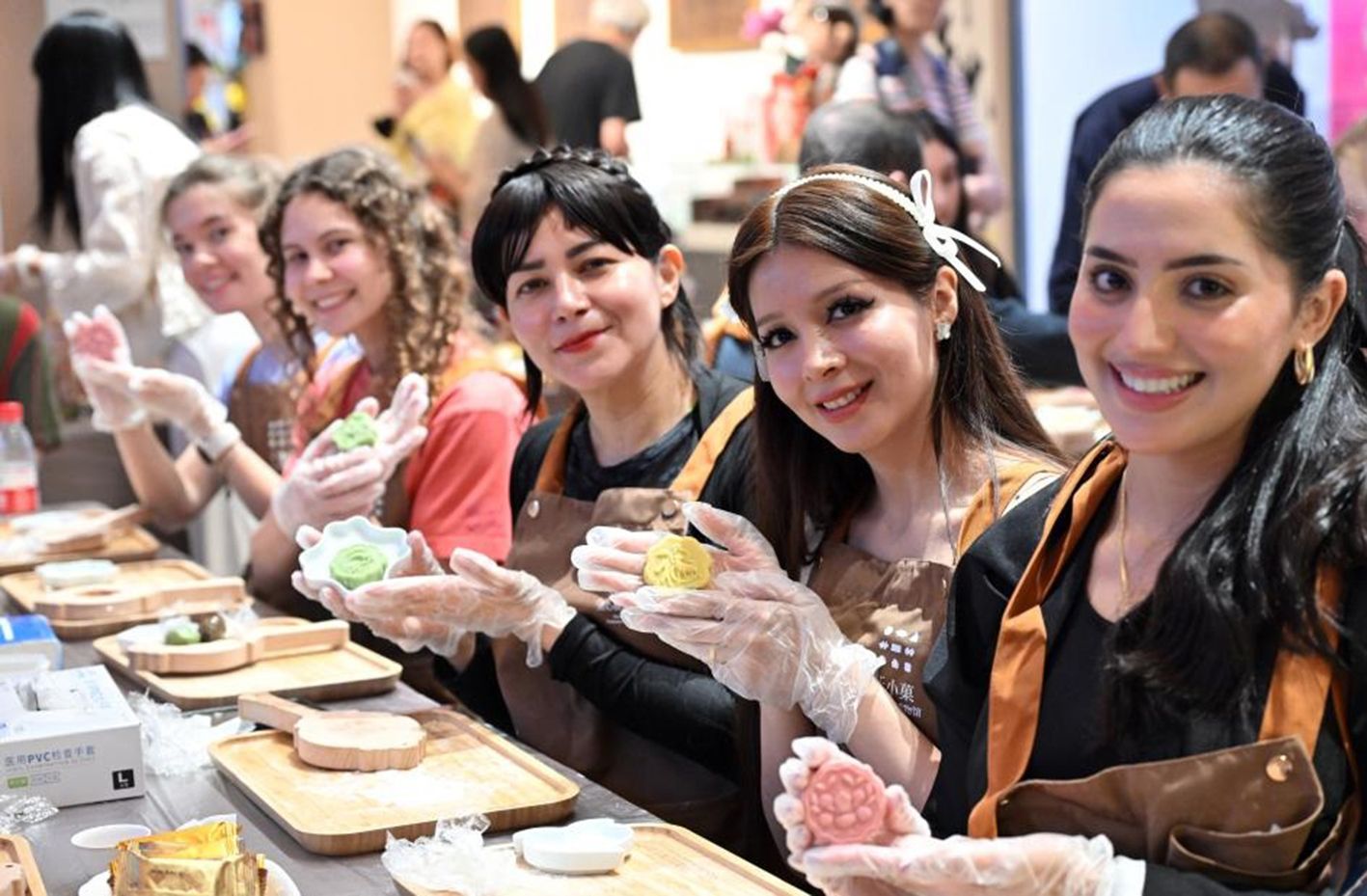 9月29日,在北京市朝阳区于小菓点心模具博物馆,中外青年展示自己制作的月饼。(新华社)