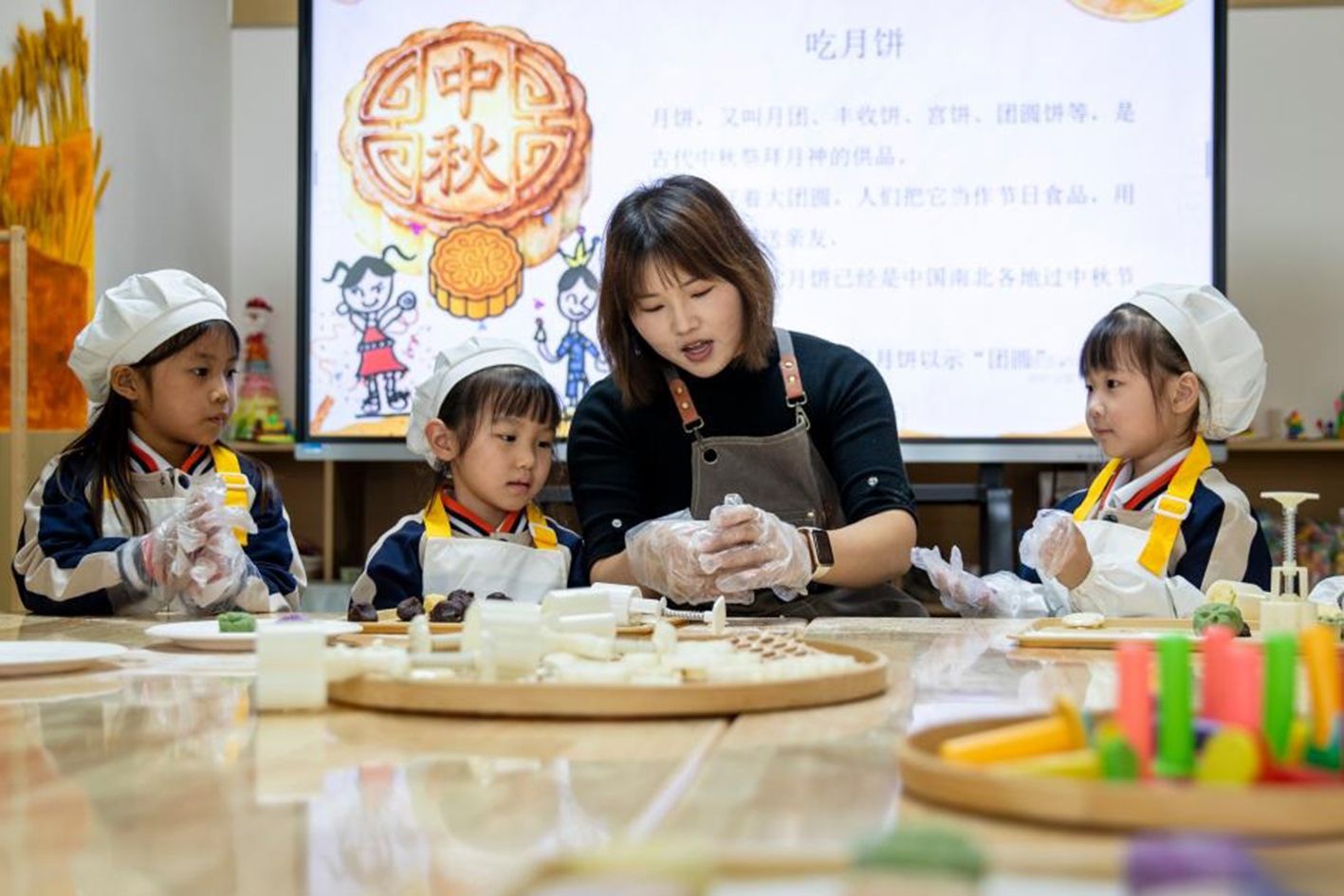 9月29日,在河南省商丘市睢县古襄路幼儿园,小朋友们在老师的讲解下学习制作冰皮月饼,了解中秋习俗。(新华社)