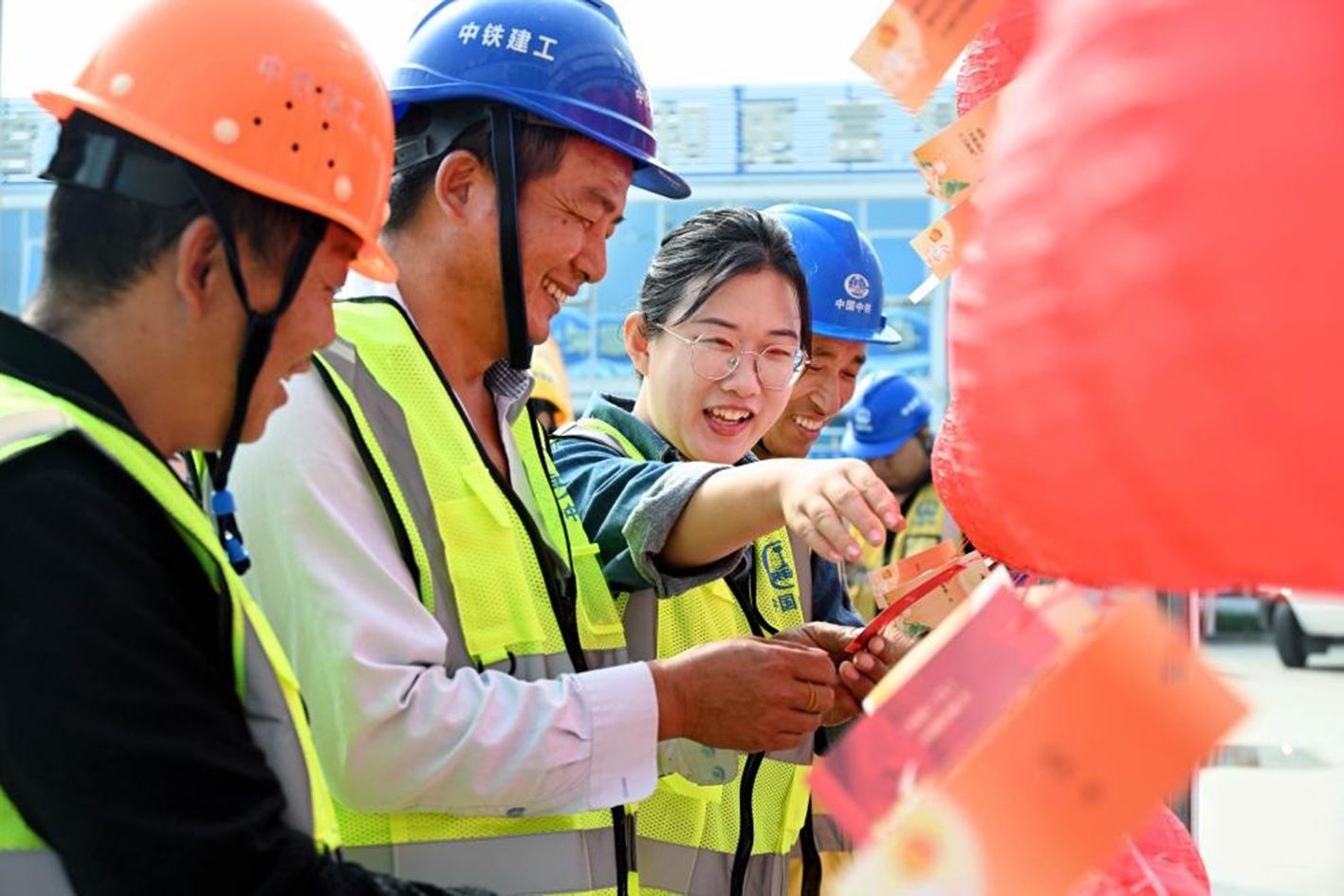 9月29日,工友们在中铁建工青岛火车北站东广场项目部迎国庆班组主题活动上猜灯谜。(新华社)