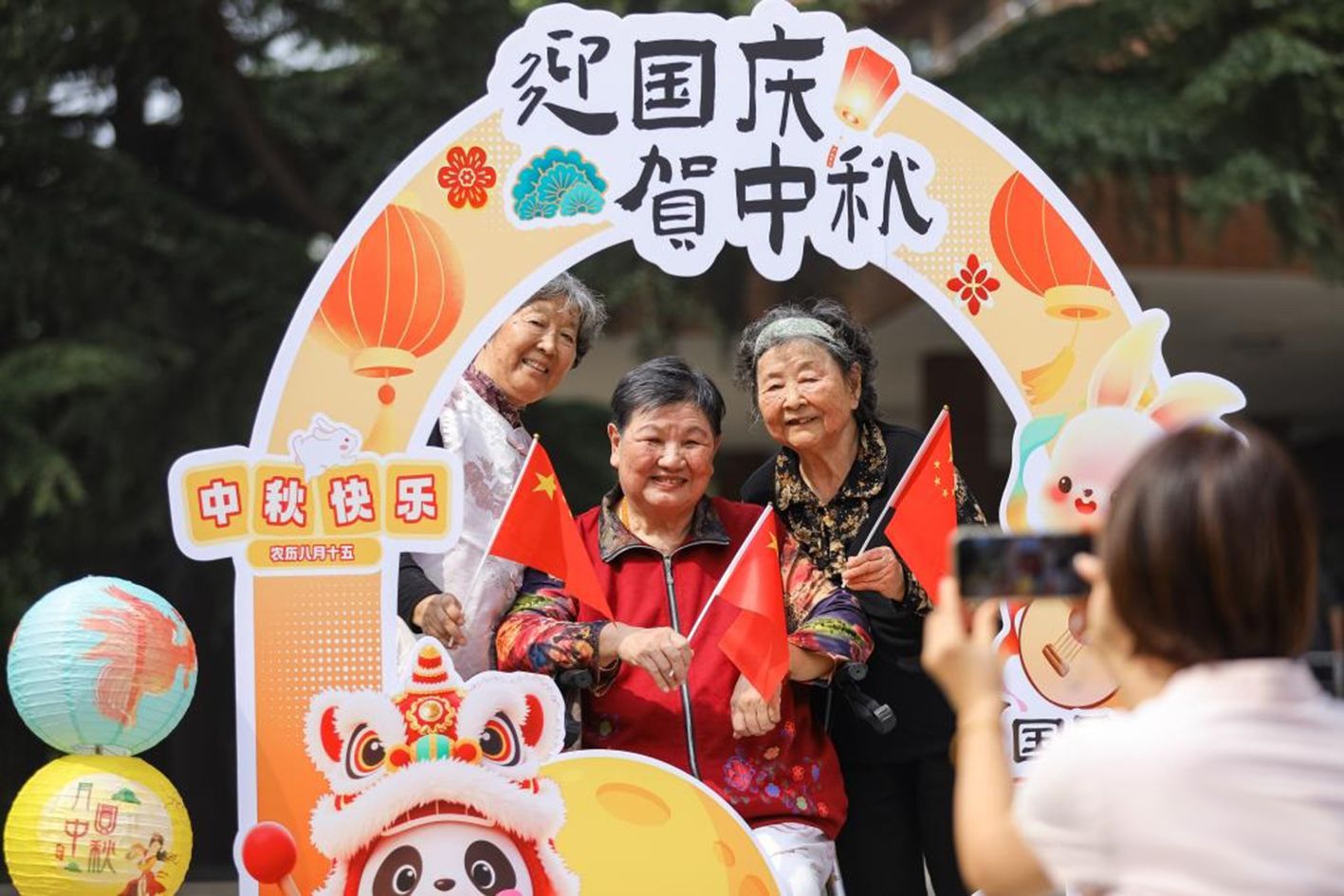 9月29日,在山东省青岛市李沧区颐福养老院,工作人员在“喜迎国庆 月满中秋”主题活动上为老人们拍照。(新华社)