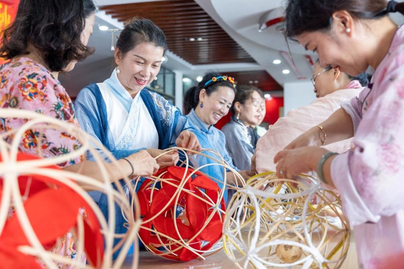 9月28日,在浙江省温岭市横峰街道马鞍桥村文化礼堂,居民们制作“滚灯”。(新华社)