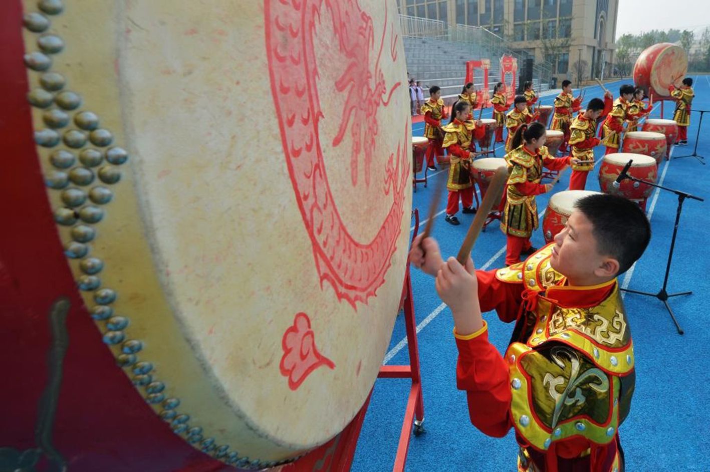 9月29日,在山东青岛启润实验学校举行的迎国庆主题活动中,学生表演鼓舞。(新华社)