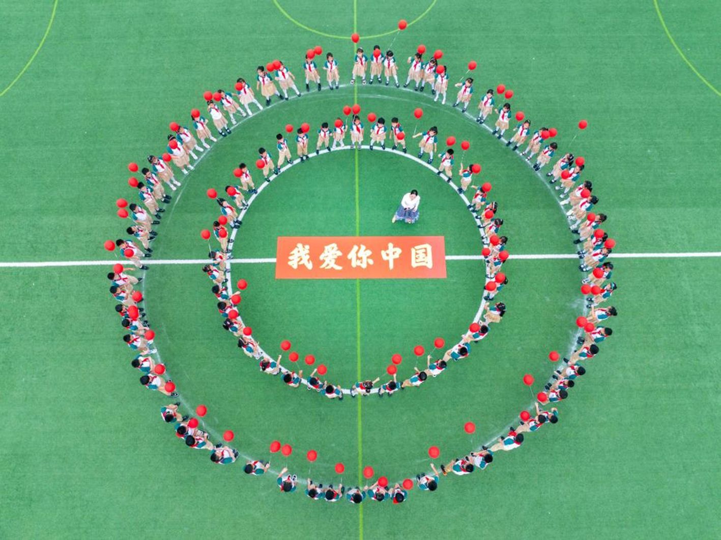 9月28日,江苏省泰州市姜堰区东桥小学教育集团东板桥校区学生学唱爱国歌曲,迎接国庆节(无人机照片)。(新华社)