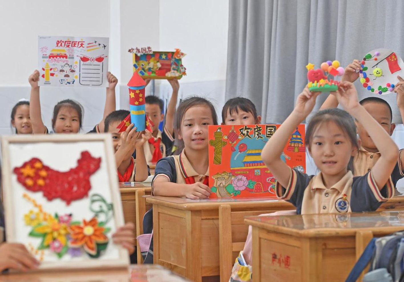 随着“双节”的临近,连日来,福建省泉州市泉港区各中小学陆续开展 “我为祖国送祝福”主题教育活动,学生们通过绘画、手工制作等多彩活动,喜迎国庆。(中国日报网)