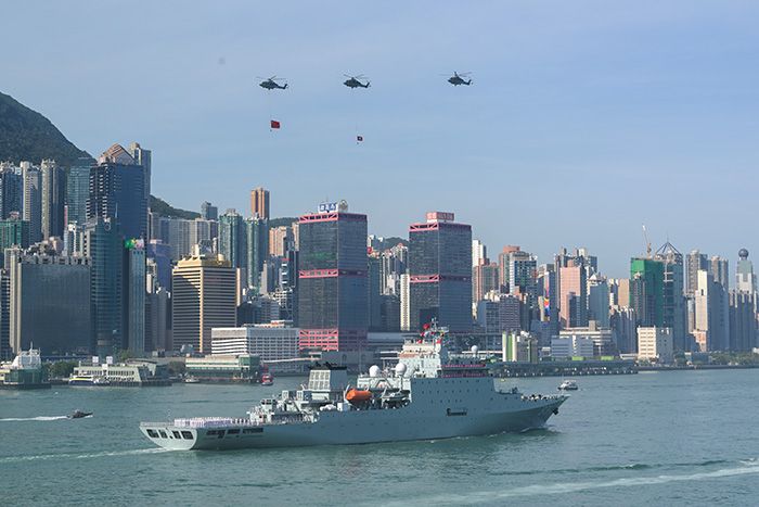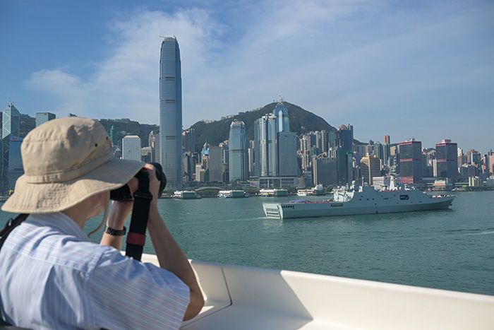 9月30日,解放军海军戚继光舰、沂蒙山舰抵达香港水域。图为民众拍摄沂蒙山舰。(图/ 中新社)