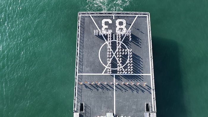 图为在戚继光舰后甲板上,100余名官兵摆出“76”字样。(图/解放军驻香港部队)