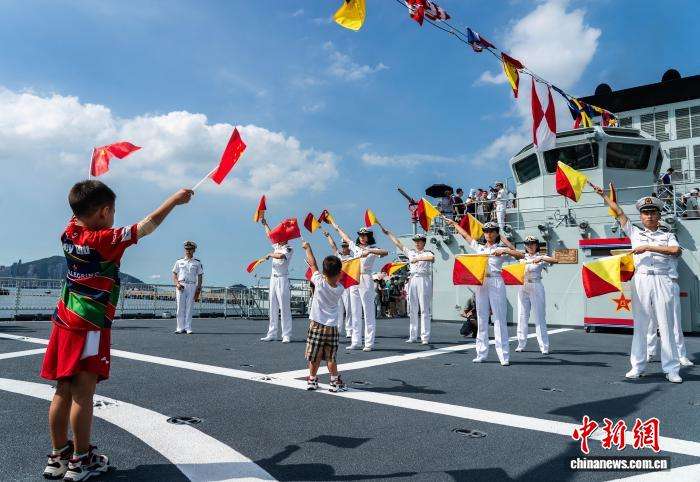 10月1日,停泊于中国人民解放军驻香港部队昂船洲军营的海军戚继光舰(舷号83)和沂蒙山舰(舷号988)举行舰艇开放活动,接受市民登舰参观,军民共庆新中国成立76周年。图为小朋友跟随戚继光舰的海军学员学习旗语。 中新社记者侯宇摄