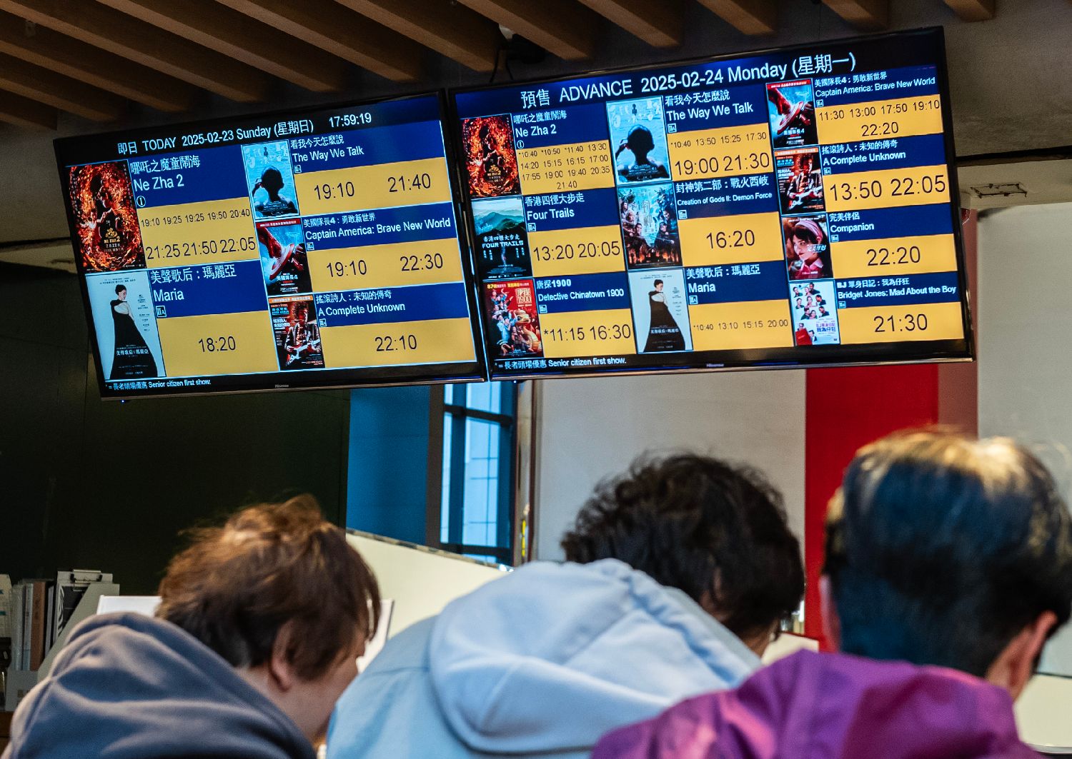 当地时间2月23日傍晚,香港一家电影院的票务信息显示屏显示当天剩余时段及翌日的动画电影《哪吒之魔童闹海》(《哪吒2》)的排片数量多于其余影片。(图/中新社)