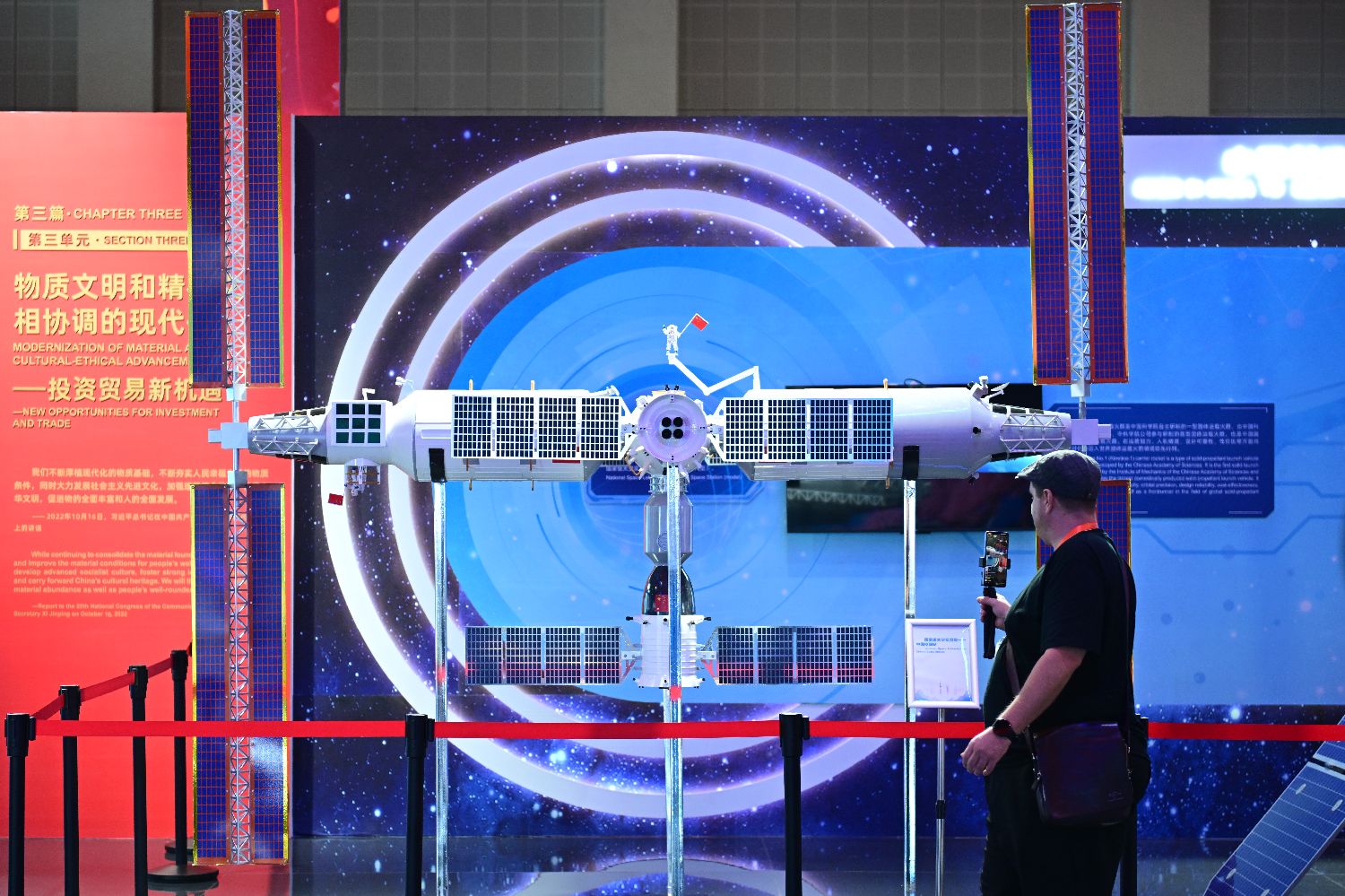 2024年11月5日,观众在进博会中国馆参观拍摄中国空间站模型。(图/中新社)