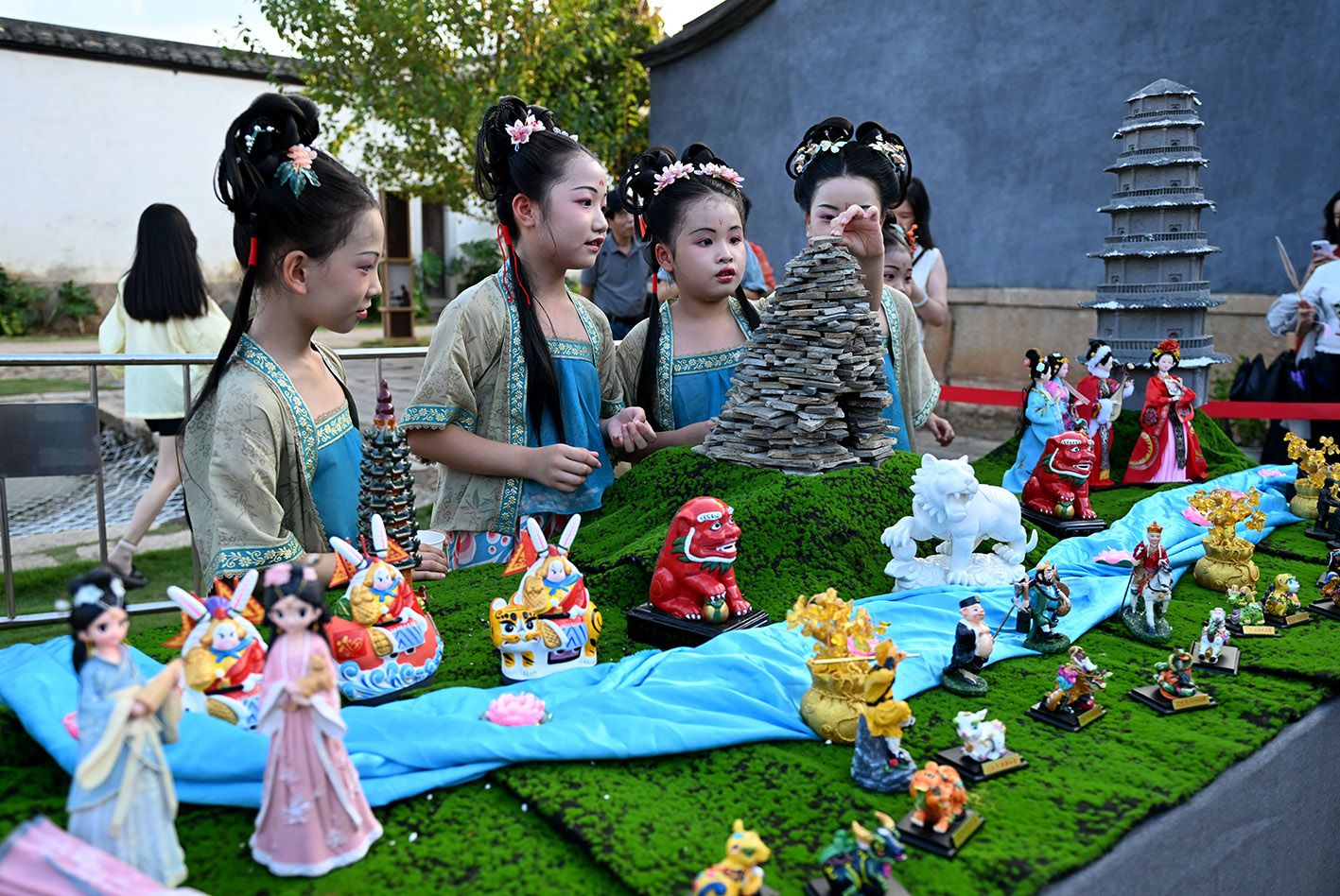 10月5日,“花好月圆夜共享邻里情”中秋民俗活动在福建省福州市仓山区梁厝特色历史文化街区举办。图为小朋友体验福州中秋“摆塔”习俗。(中新社)