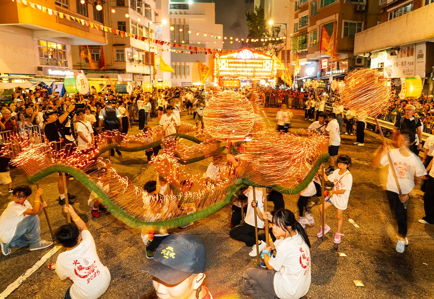10月5日,香港“大坑舞火龙”再度于铜锣湾大坑的大街小巷上演。“大坑舞火龙”2011年被列入国家级非物质文化遗产代表性项目名录,是香港庆祝中秋节的重要节庆盛事活动。图为少年儿童用发光二极管(LED)制成的“小火龙”进行“起结龙团”(又称“打龙饼”)表演。(中新社)