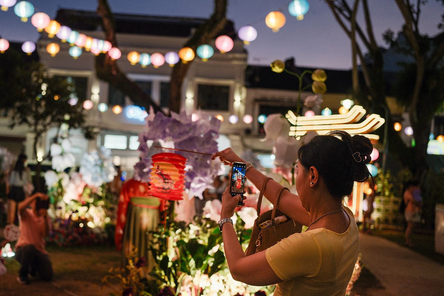 当地时间10月5日晚,正在马来西亚槟城州乔治市打铜仔街公园举办的花灯会吸引众多游客。(中新社)