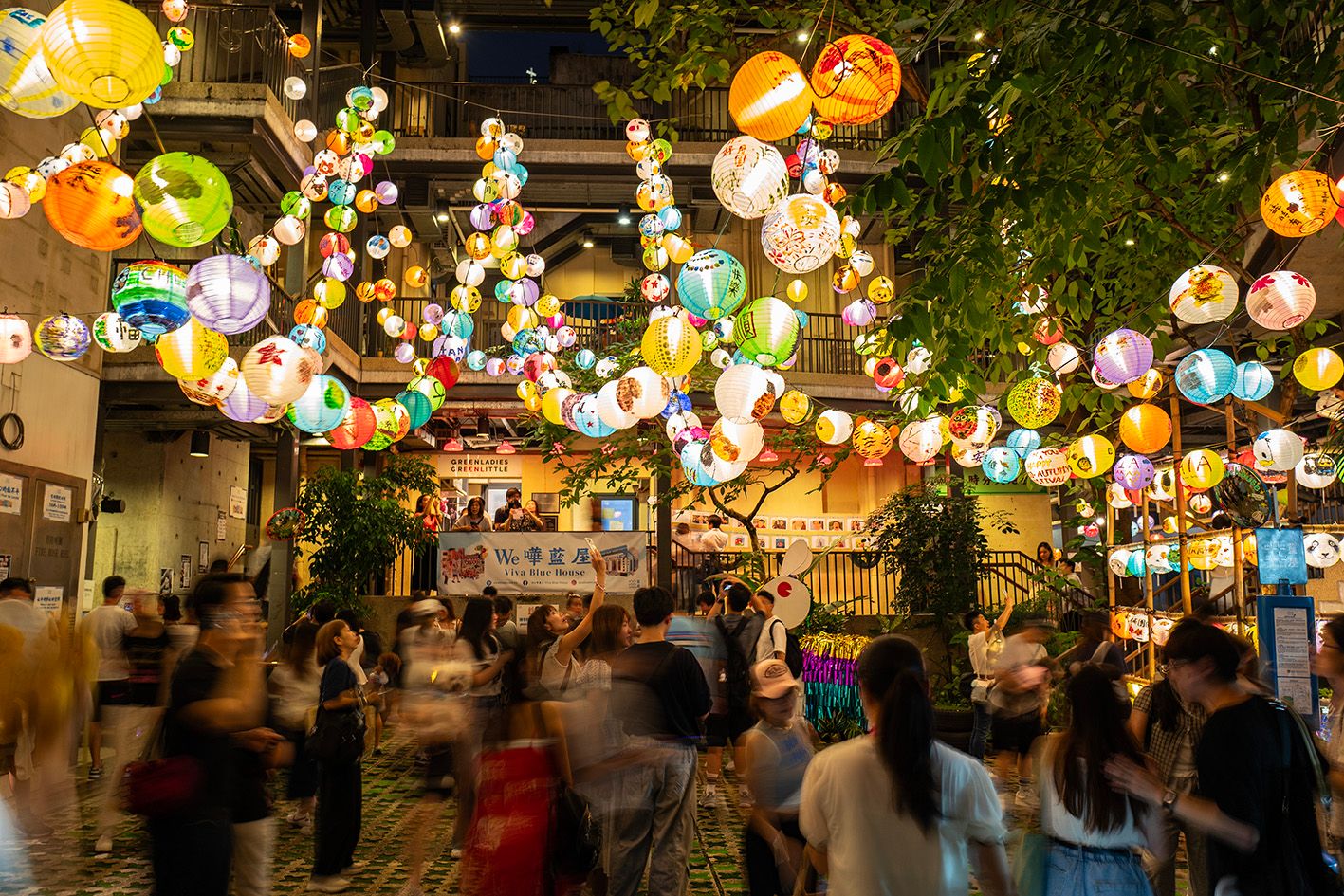 10月4日晚,位于香港湾仔的香港一级历史建筑“蓝屋”点亮主题为“悦夜月蓝”的彩灯艺术装置,逾700个由香港艺术家和湾仔街坊手绘的花灯为即将到来的中秋节增添喜庆氛围,吸引众多市民和游客前来拍照“打卡”。(中新社)