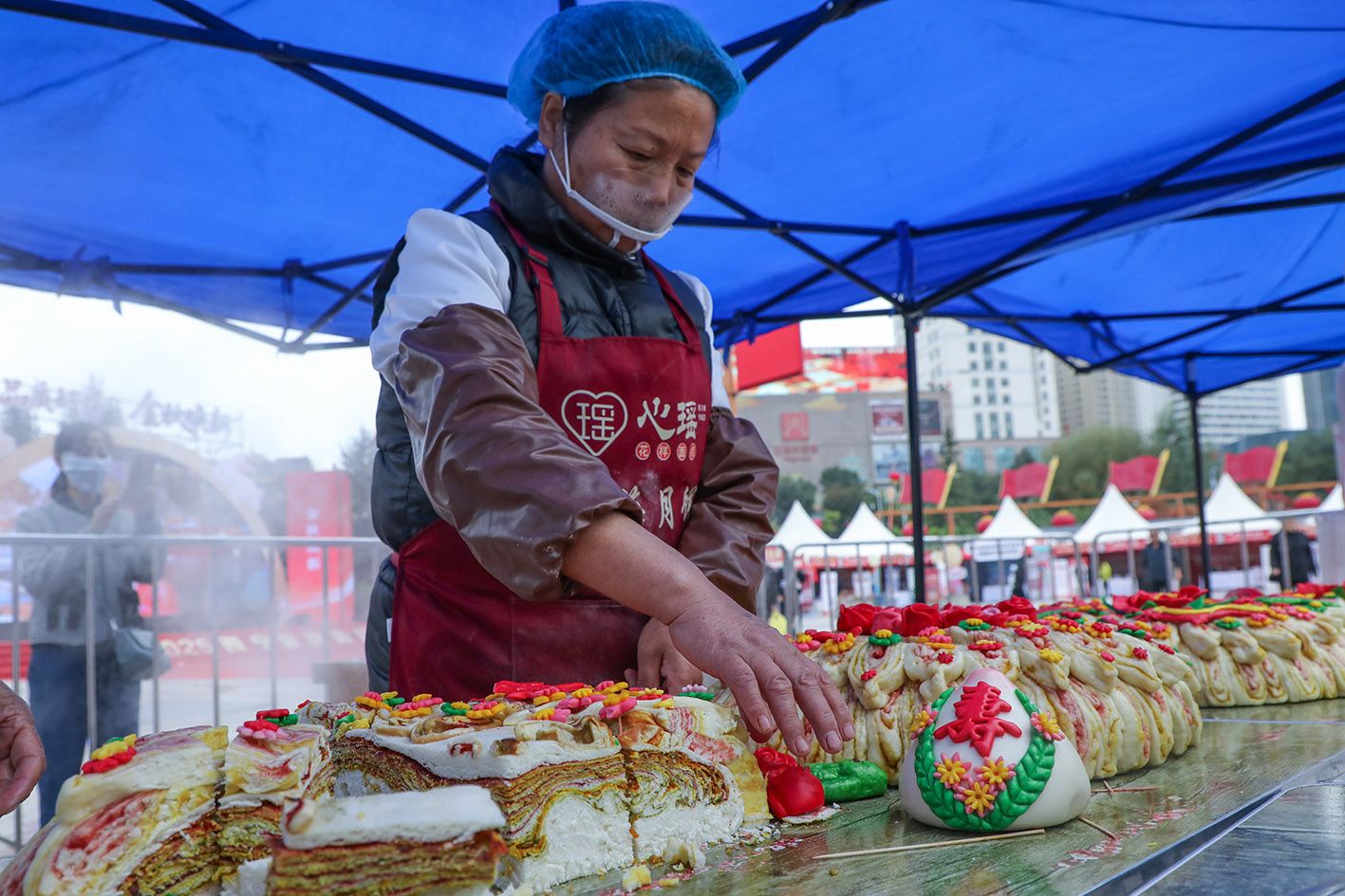 10月5日,民众在青海省西宁市中心广场观看青海大月饼制作过程并免费品尝。每年中秋节,当地民众习惯将面粉揉成团后,抹上用食用油混合香豆粉、姜黄粉等纯植物制成的“色料”,表面镶嵌精致的彩色面花,上炉用笼屉蒸出花式大馍。图为制作完成的月饼。(中新社)