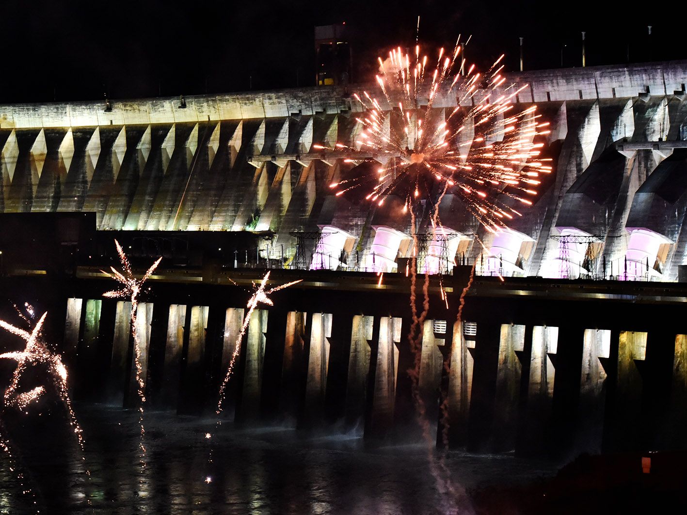 当地时间10月4日晚,巴西圣保罗亚洲文化中心在巴西瀑布城伊瓜苏北郊举办“伊泰普中秋之夜”活动。巴西伊泰普水电站位于巴西与巴拉圭之间的界河----巴拉那河上,是世界第二大水电站,由巴西与巴拉圭共建,发电机组和发电量由两国均分。当晚伊泰普水电站点亮璀璨灯光,烟花映照夜空。(中新社)