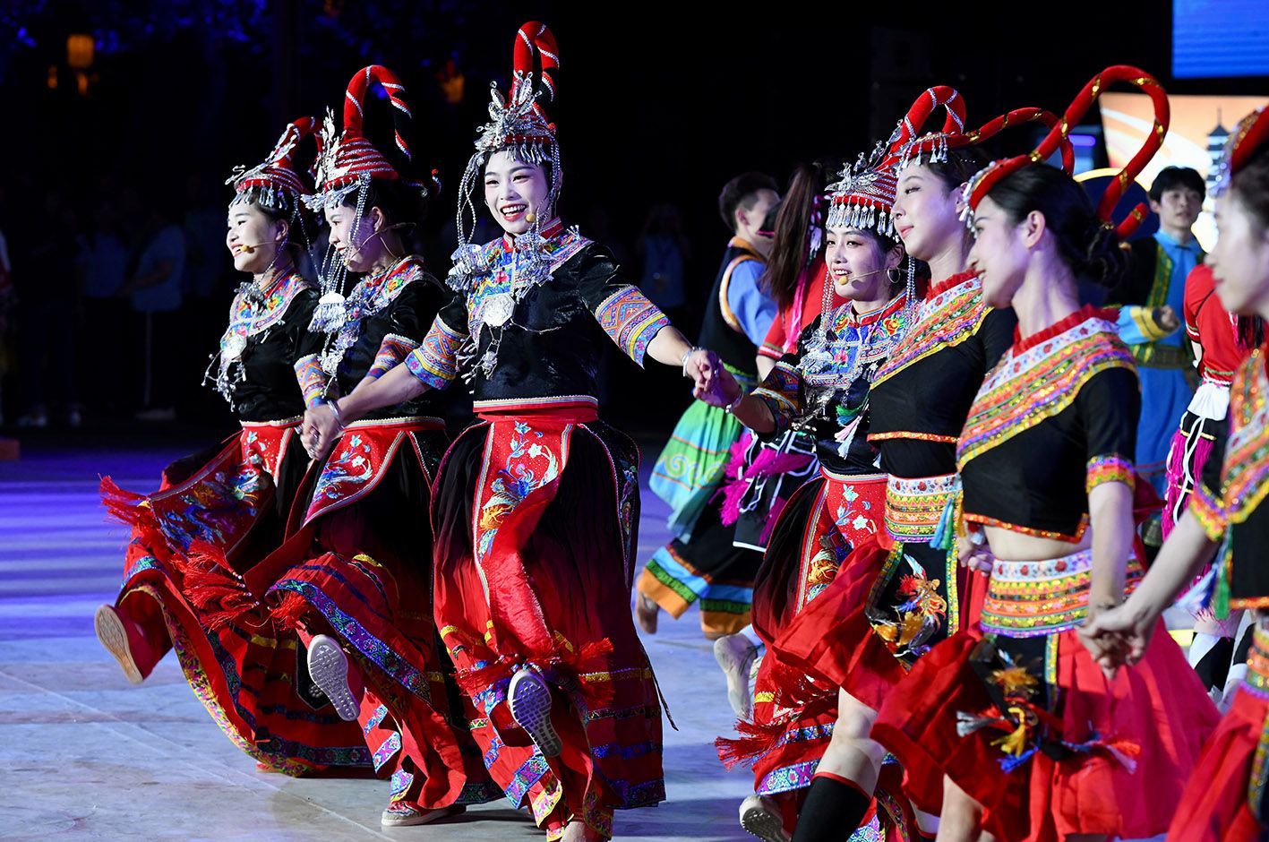 10月4日晚,250余名两岸同胞在福建省福州市共同参加“福聚中秋月 ‘船’承两岸情”2025年两岸同胞迎中秋联谊活动,当500架无人机在天空中排列出“两岸一家亲 闽台亲上亲”等图案时,现场欢呼阵阵,抒发出两岸同胞共迎中华民族传统佳节的喜悦。图为福建畲族姑娘现场载歌载舞。(中新社)