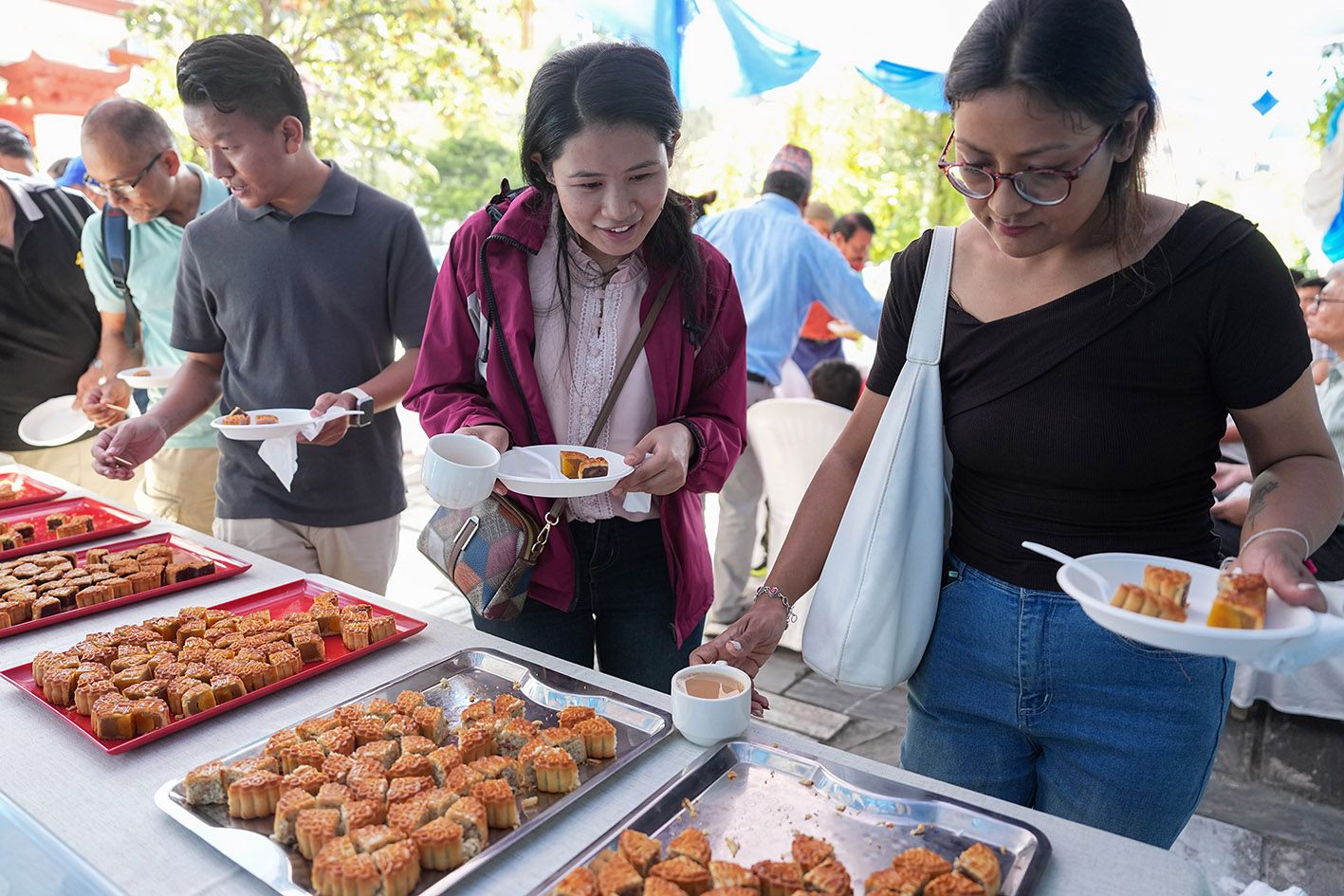 近日,尼泊尔中国文化中心在尼首都加德满都举行中秋主题活动,近百位中尼各界友人欣赏具有两国特色的文艺表演,共庆即将到来的中秋佳节。图为尼泊尔友人挑选多种口味的月饼。(中新社)