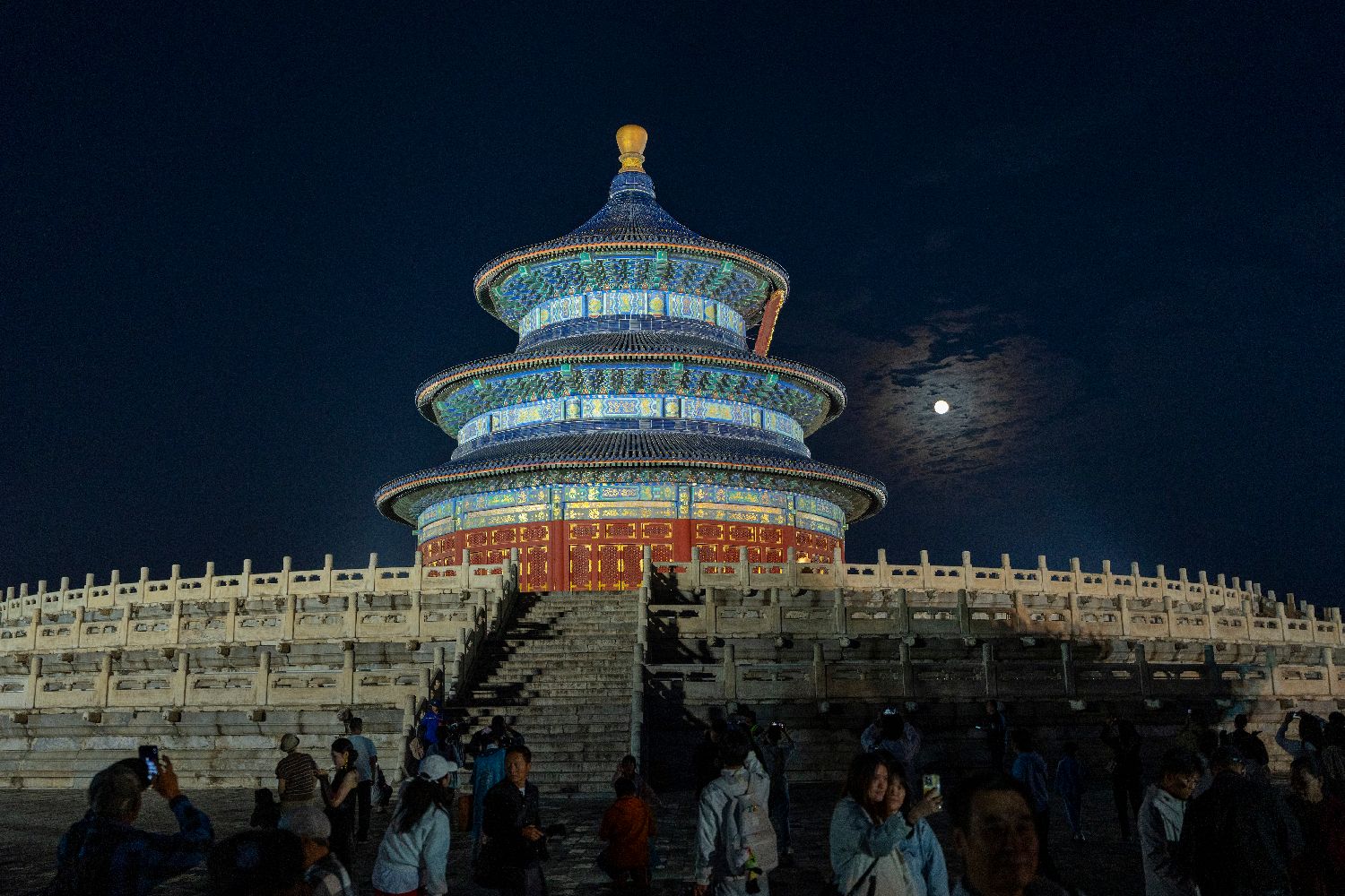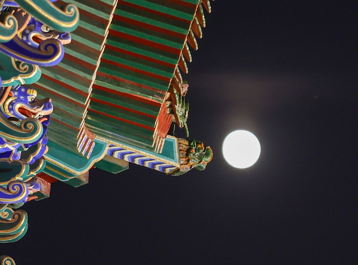 10月6日,北京天坛公园祈年殿亮灯,一轮圆月从东方升起,与祈年殿交相辉映。(中新社)