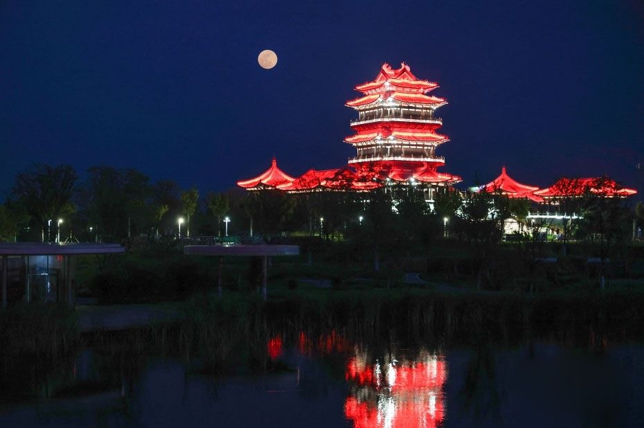 10月7日,江苏连云港园博园秦东阁与夜空满月同框。(中新网)